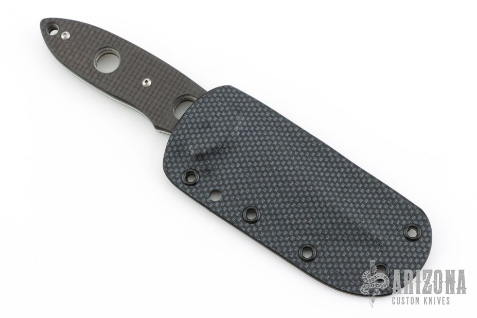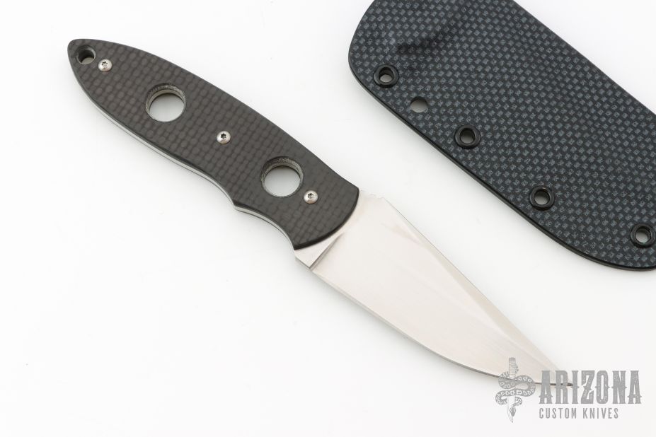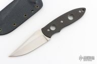 This Memphis Toothpick by Crawford Knives features a hand rub stain finished clip point blade with notched thumbrest, .119" blade stock and 1.188" blade depth, full tang construction with carbon fiber scales. Comes with a kydex sheath. Has a couple very light scratches, otherwise excellent condition.