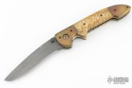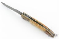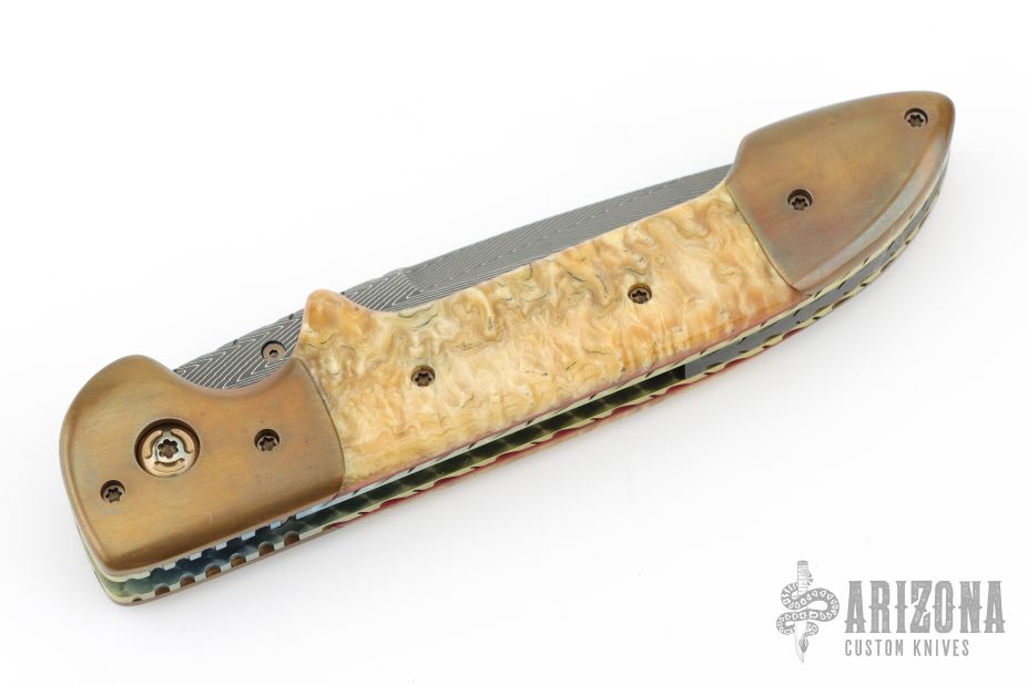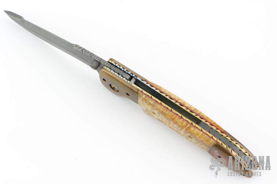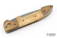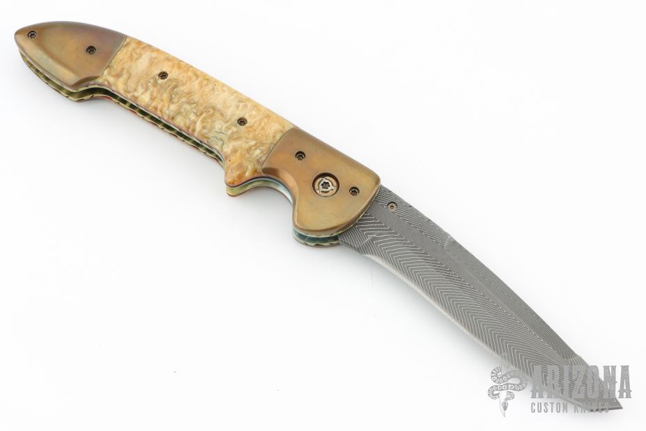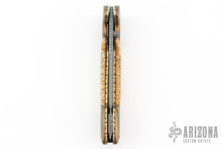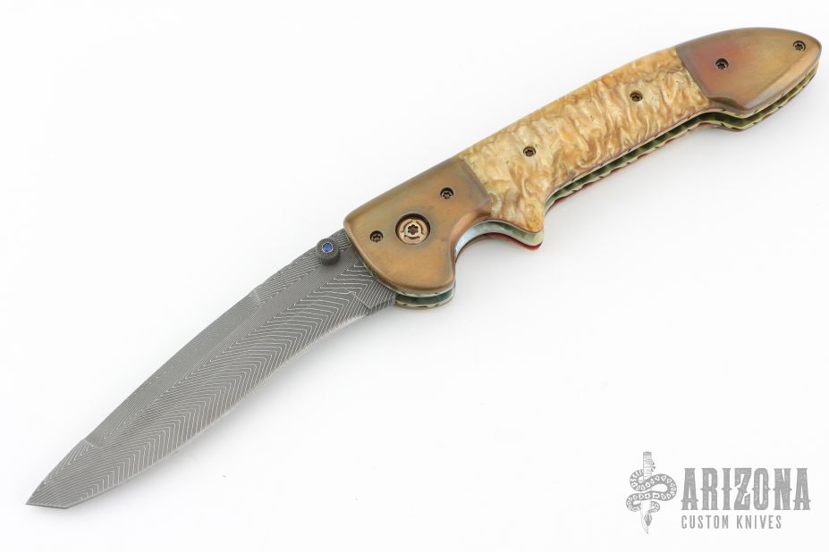This Perfigo folder from Crawford Knives features a Damascus tanto blade with a blue stone inlaid Damascus thumbstud, and false top edge and fileworked spine. The handle has dovetailed brass bolsters, MuskOx horn scales with red liners, fileworked and anodized titanium liners with jeweled interiors, fileworked Damascus backspacer. Nice detent, blade seating and lockup. Comes with padded zippered case. Excellent condition.