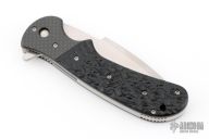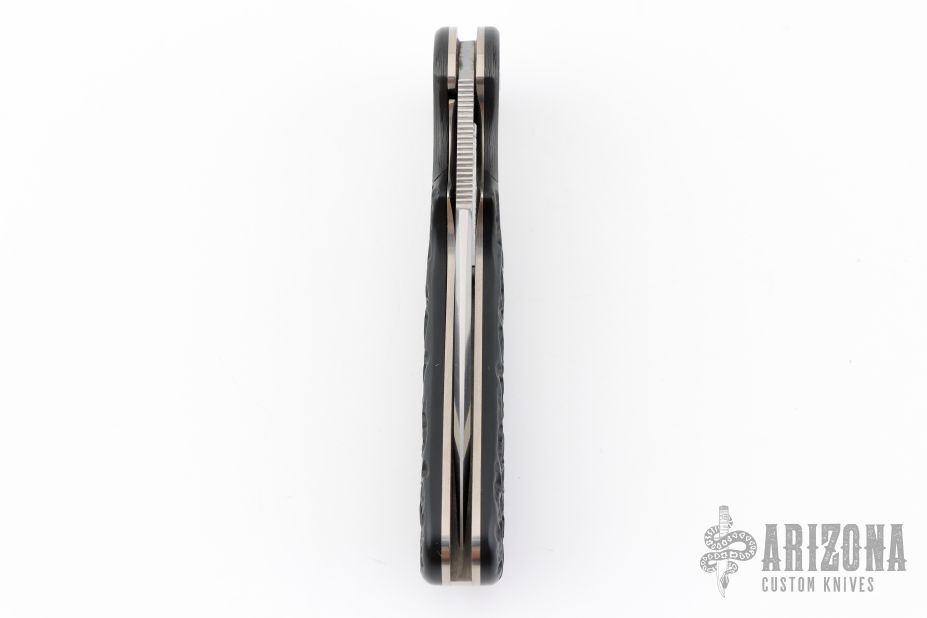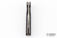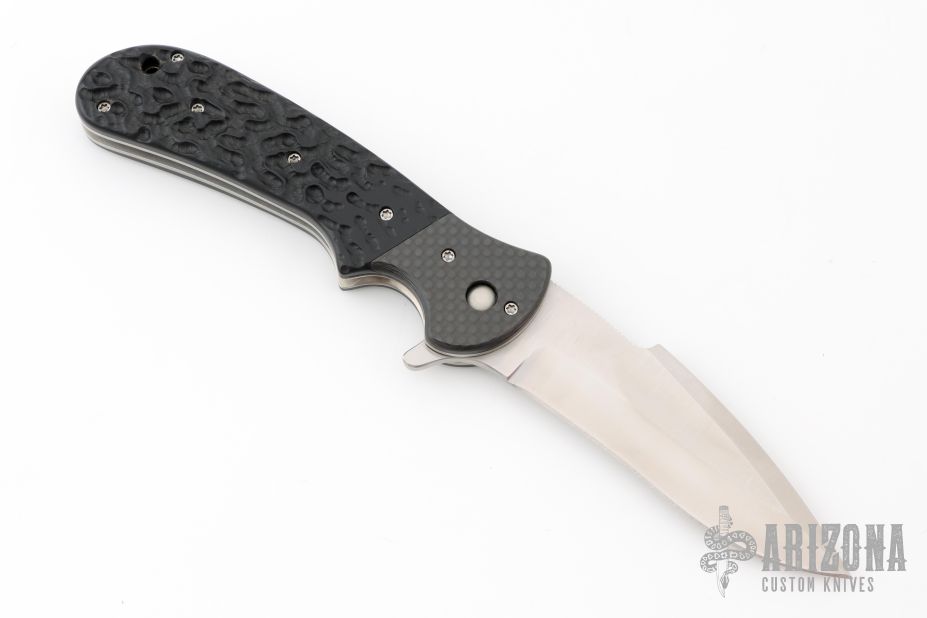 This Wortac Flipper by Crawford Knives features a satin finished blade with false top edge and notched thumbrest and a flipper. The handle has dovetailed carbon fiber bolsters, jigged black paper micarta scales, titanium liners, stainless steel backspacer. Nice detent, lockup and blade seating. Comes with a zippered case. Excellent condition.