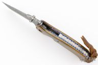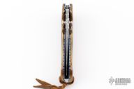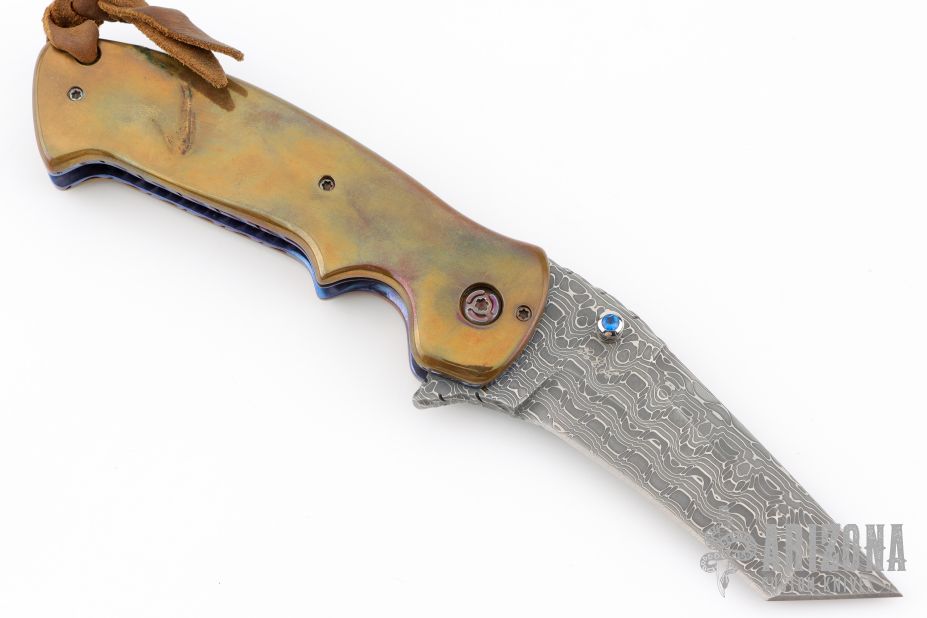 This Dressed Kasper Flipper by Crawford Knives features a Damascus tanto blade with dual blue stone inlaid thumbstuds, fileworked thumbrest and flipper, false top edge. The handle has brass scales, fileworked and anodized titanium liners with jeweled interiors, fileworked stainless steel backspacer. Nice blade seating, detent and lockup. Comes in a zipper case. Excellent condition.