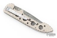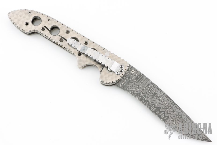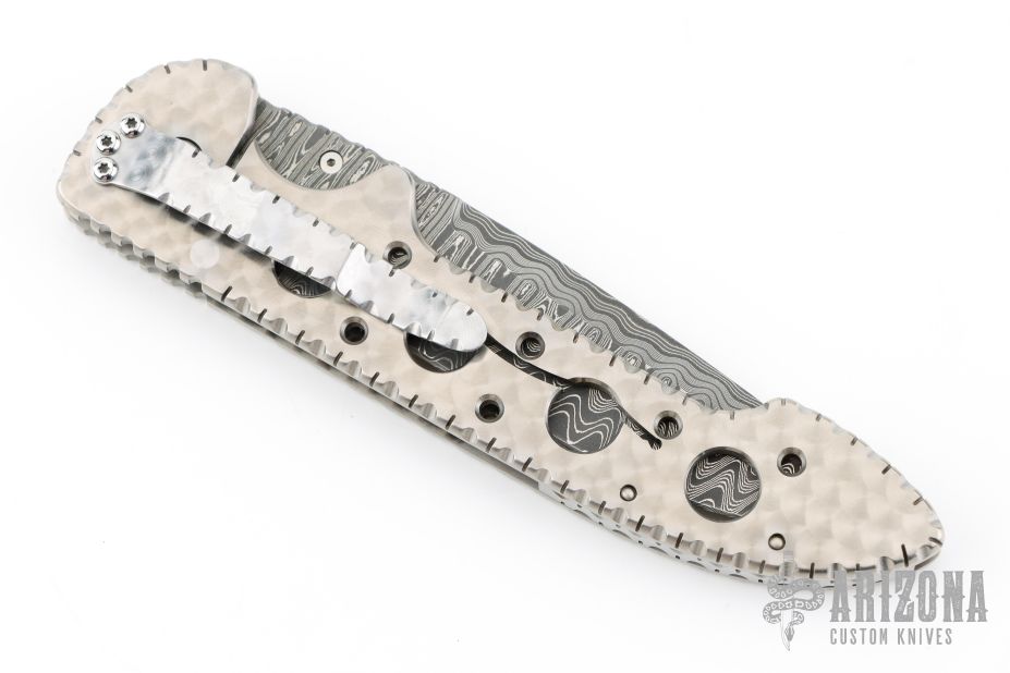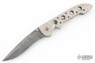 This Dressed Perfigo folder from Pat & Wes Crawford features a Damascus blade with a single clear stone inlaid thumbstud, fileworked spine and false top edge. The handle has a jeweled and fileworked titanium frame, fileworked stainless steel backspacer, and a tip down fileworked stainless steel clip. Smooth action with a nice detent and lockup. Excellent condition. Comes with a zippered case.