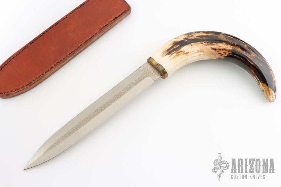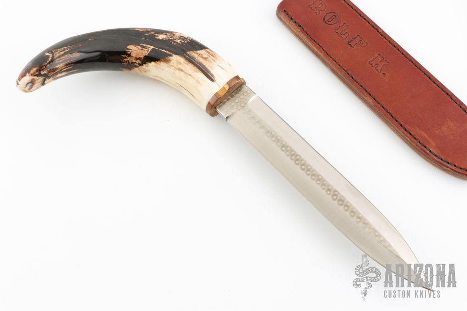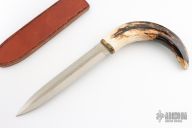 This Dagger by Pat Crawford features a satin finished double edged blade with jeweled flats, .167" blade stock and 1.284" blade depth, hidden tang construction. The handle has a brass guard and a warthog tusk grip. Has a couple light scuffs, otherwise excellent condition. Comes with brown leather sheath stamped "ROLF K."