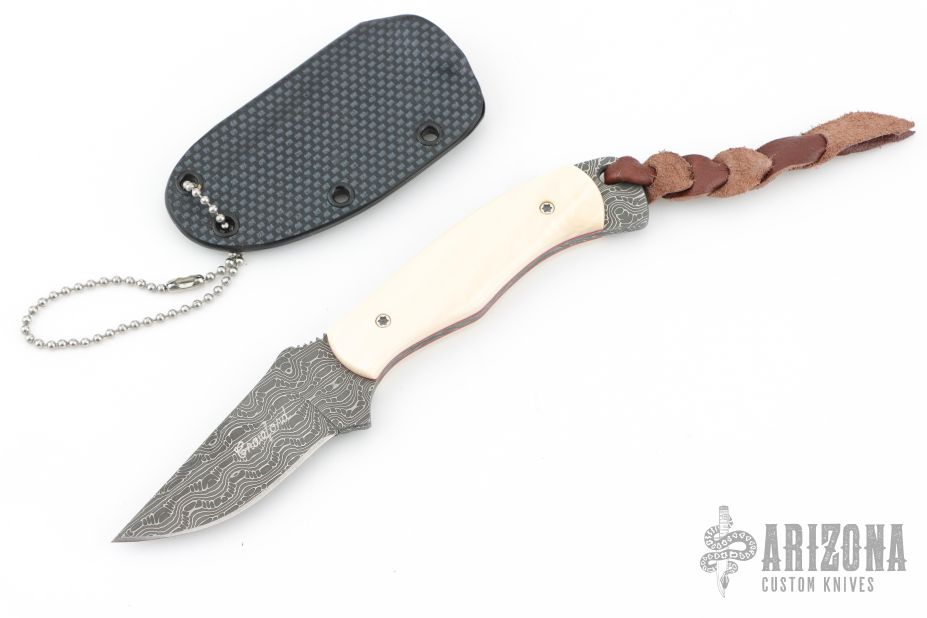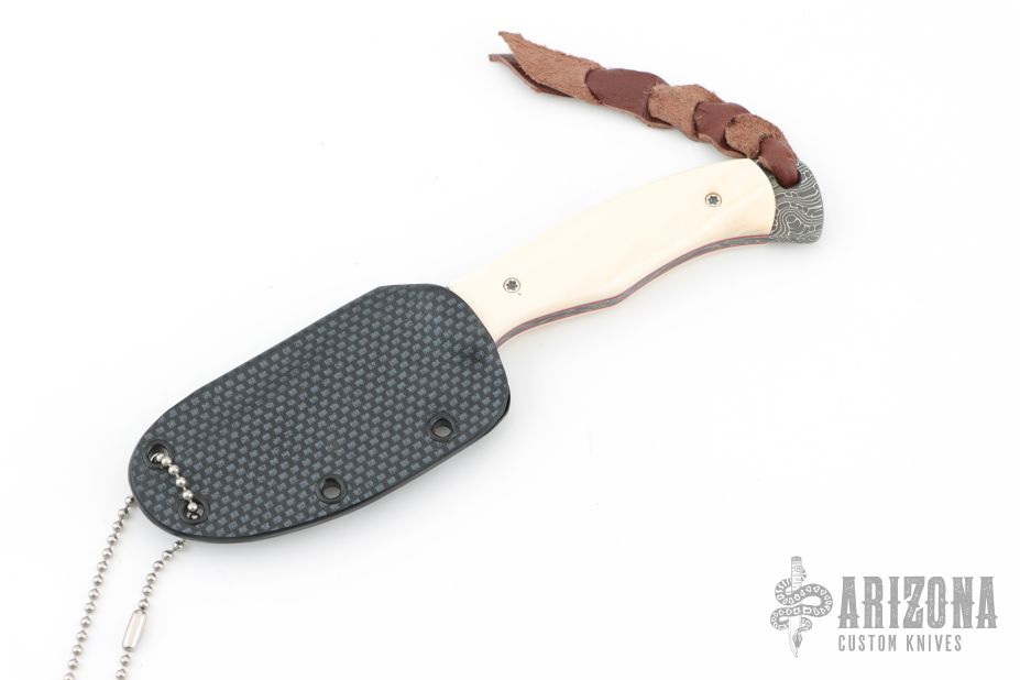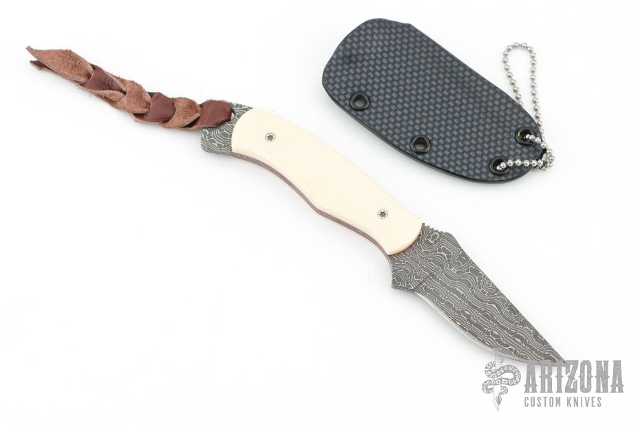This Neck Knife by Crawford Knives features a Damascus blade with notched thumbrest, .124" blade stock and 1.125" blade depth, full tang construction with mammoth ivory scales with red liners. Comes with a kydex sheath. Excellent condition.