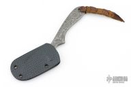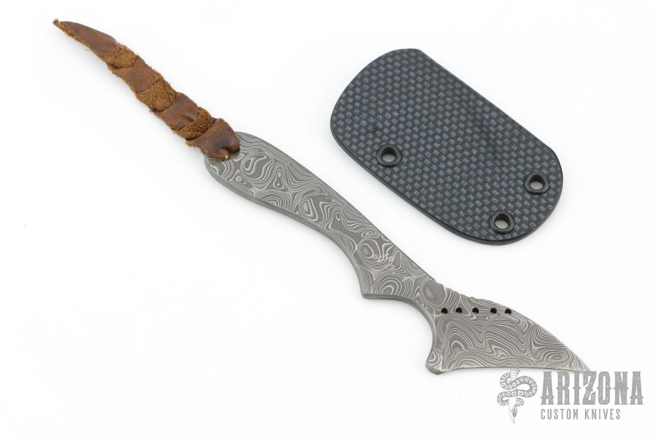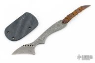 This Neck Knife by Crawford Knives features a Damascus blade with notched thumbrest, .150" blade stock and 1.115" blade depth, full tang construction. Comes with a kydex sheath. Excellent condition.