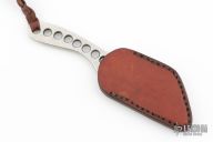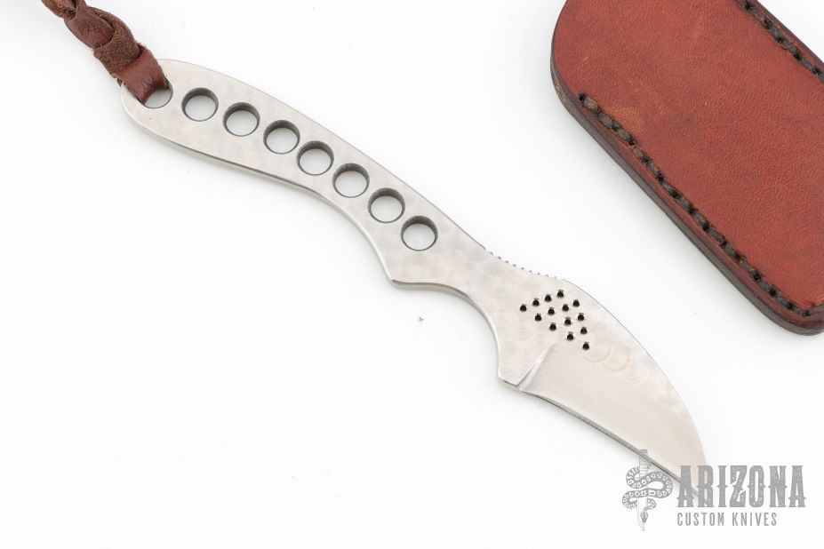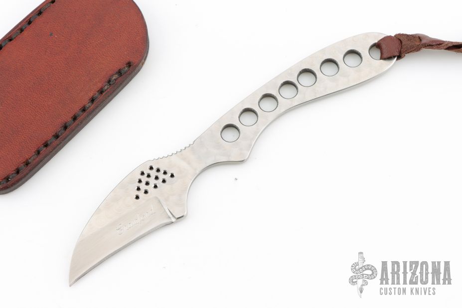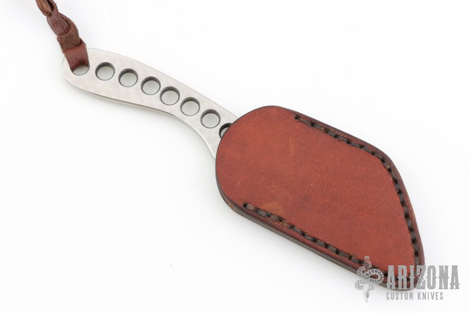 This Neck Knife by Crawford Knives features a hand rub satin finished blade with jeweled flats and notched thumbrest, .124" blade stock and 1.014" blade depth, full tang construction. Comes with a brown leather sheath. Excellent condition.