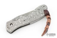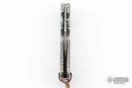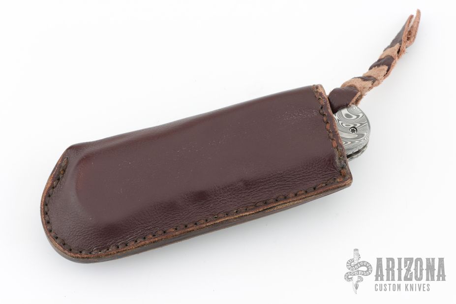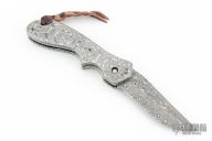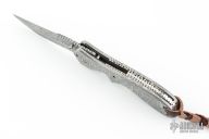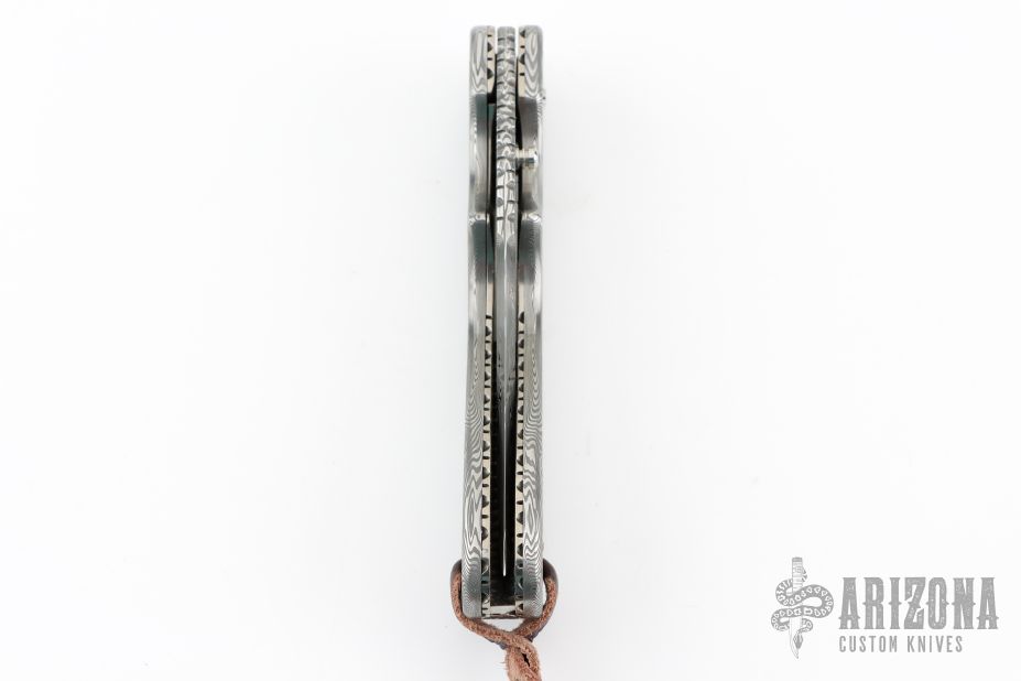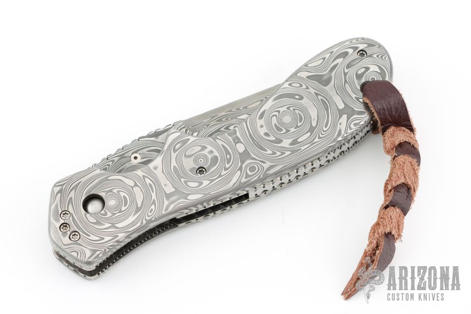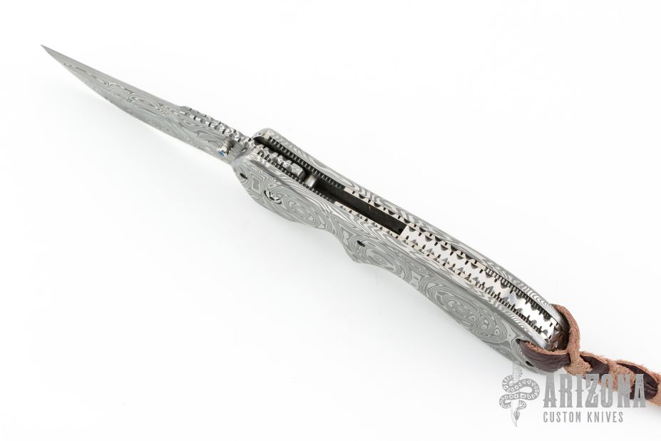 This Wortac by Crawford Knives features a Damascus blade with false top edge and fileworked thumbrest and a single thumbstud with blue stone inlay. The handle has Damascus scales, fileworked titanium liners, fileworked stainless steel backspacer. Nice detent, lockup and blade seating. Comes with a brown leather belt sheath. Excellent condition.