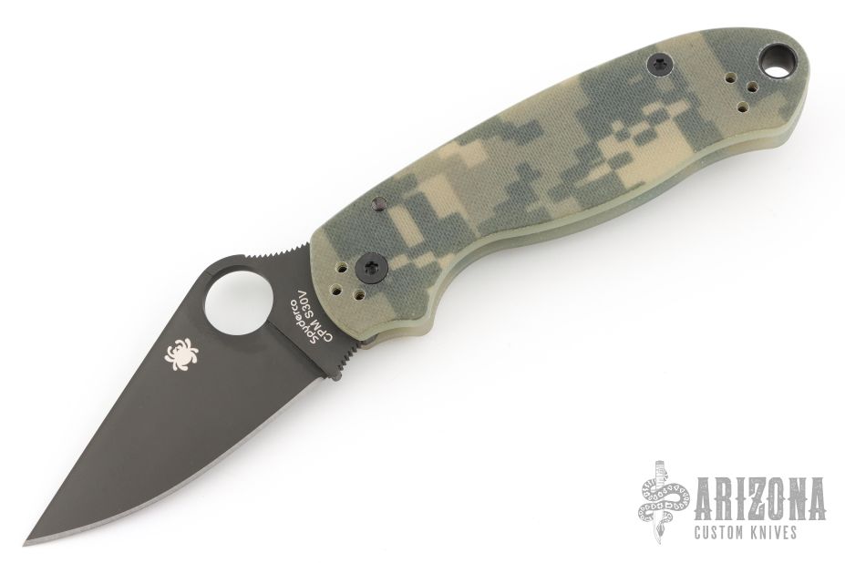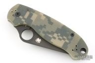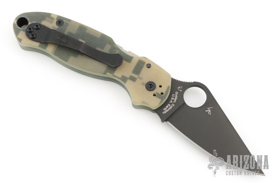 This Para 3 by Spyderco features a black finished clip point blade with thumb hole and notched thumbrest. S30V Blade Steel. The handle is comprised of a camo G-10 frame over nested steel liner and stand-offs. The steel pocket clip is 4 way adjustable. Includes original box and paperwork. New condition.