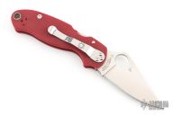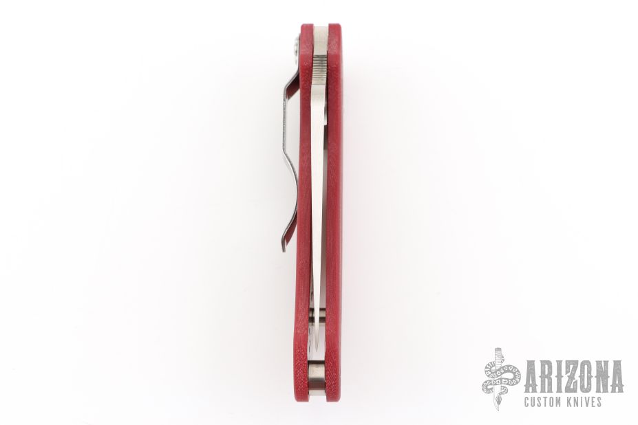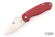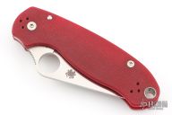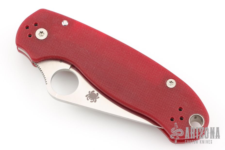 This Para 3 by Spyderco features a satin finished clip point blade with thumb hole and notched thumbrest. The handle has red G-10 scales over nested steel liners and stand-offs. The steel pocket clip is 4 way adjustable. Includes original box and papers. New condition. DLT Trading Exclusive.