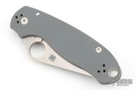 This Paramilitary 3 Linerlock Folder from Spyderco has a stonewashed finished clip point blade with thumbhole and notched thumb rest. Handle has grey G-10 scales with nested stainless steel liners and 4-way reversible clip. Includes the original box and papers.  New condition.