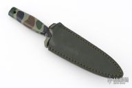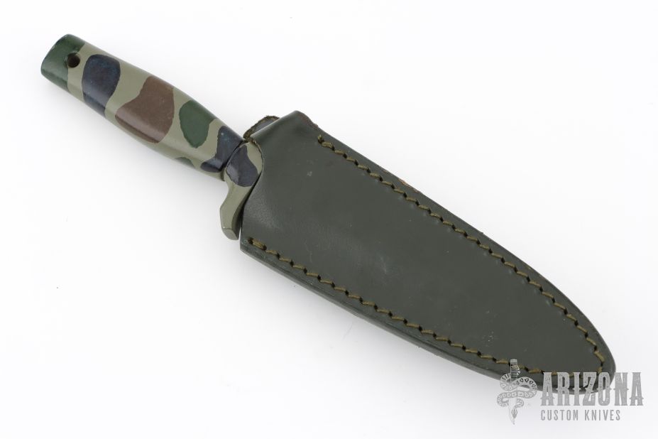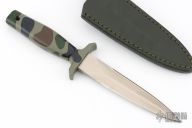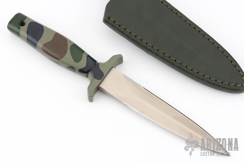 This Boot dagger features a hand rub satin finished double edged blade, .216" blade stock and .890" blade depth, hidden tang construction. Camo coated aluminum handle. Comes with green leather sheath with boot clip. Excellent condition.