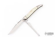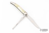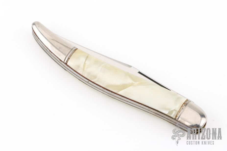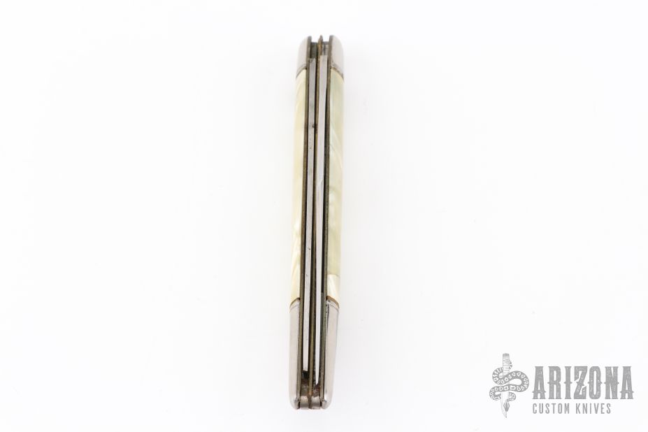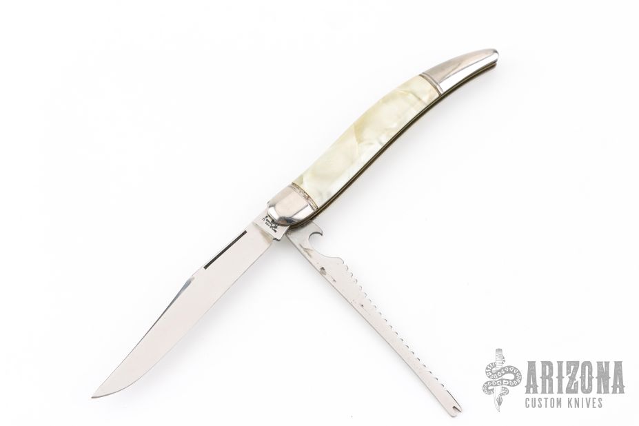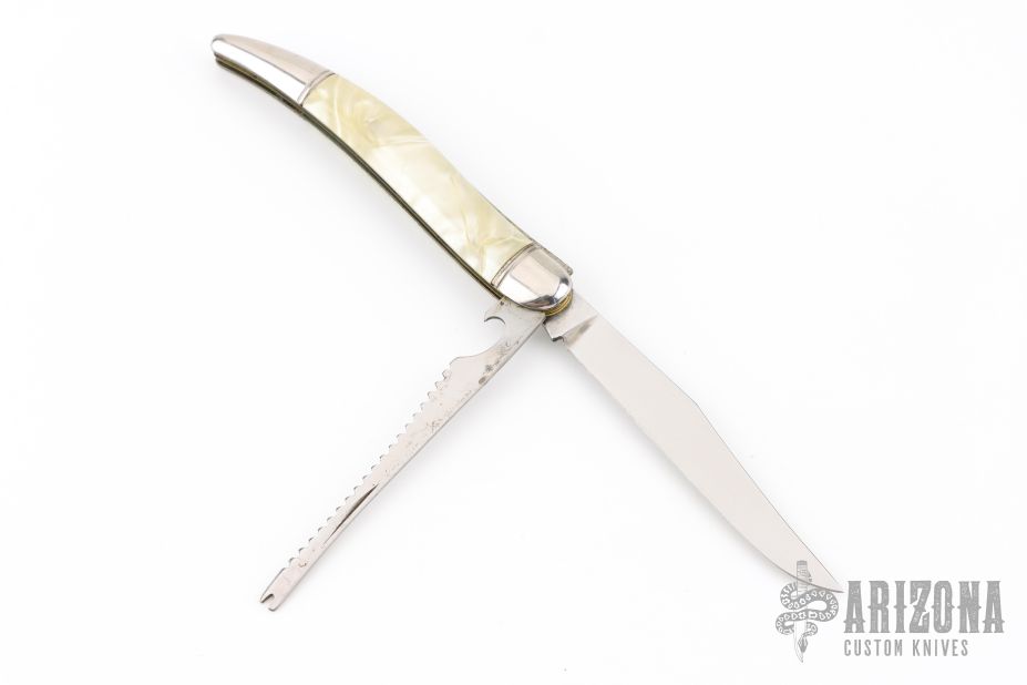 This Fishing Knife by Hammer Brand has a mirror polished blades with nail nicks. The handle has stainless steel bolsters, pearlex covers, brass liners, steel spring. Has some light staining on the scaler blade, otherwise good condition.