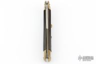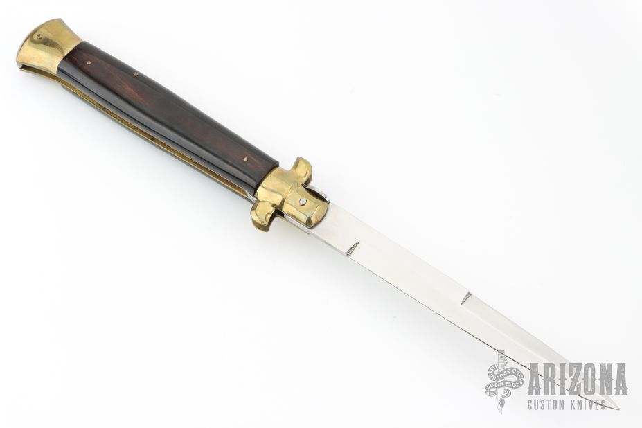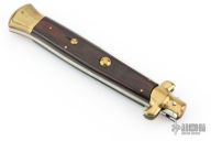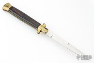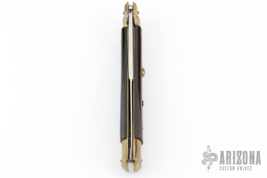 This Swivel Bolster from Stiletto Italy features a satin finished blade with false top edge. The handle is comprised of brass bolsters and pommel with wood scales over brass liners and stainless steel backspacer. Has some light scratches and patina, otherwise excellent condition.