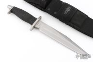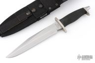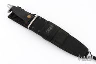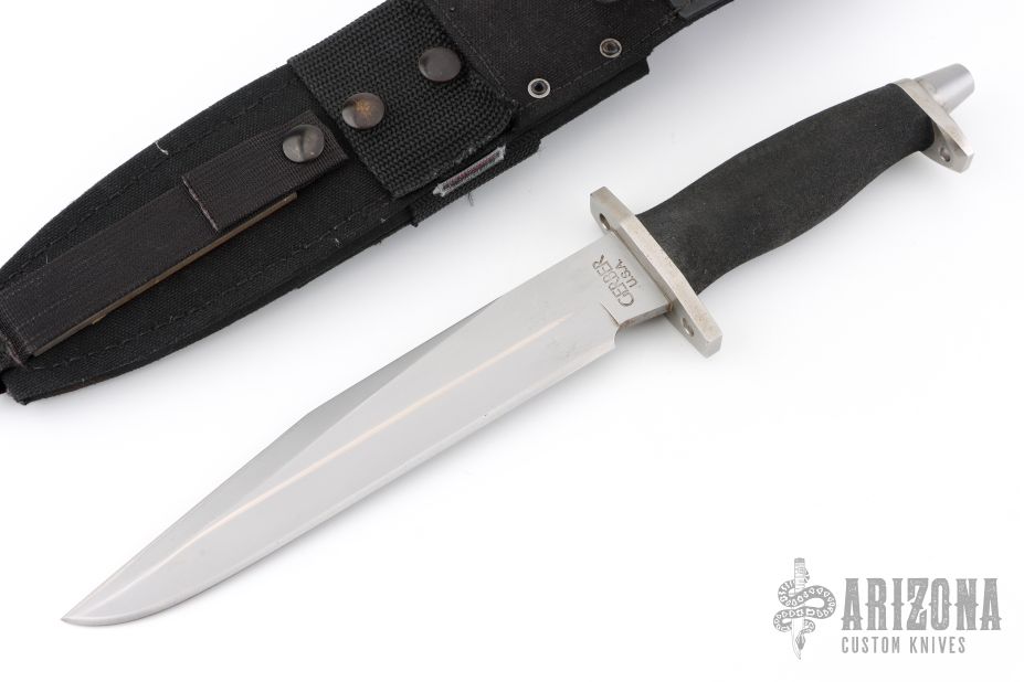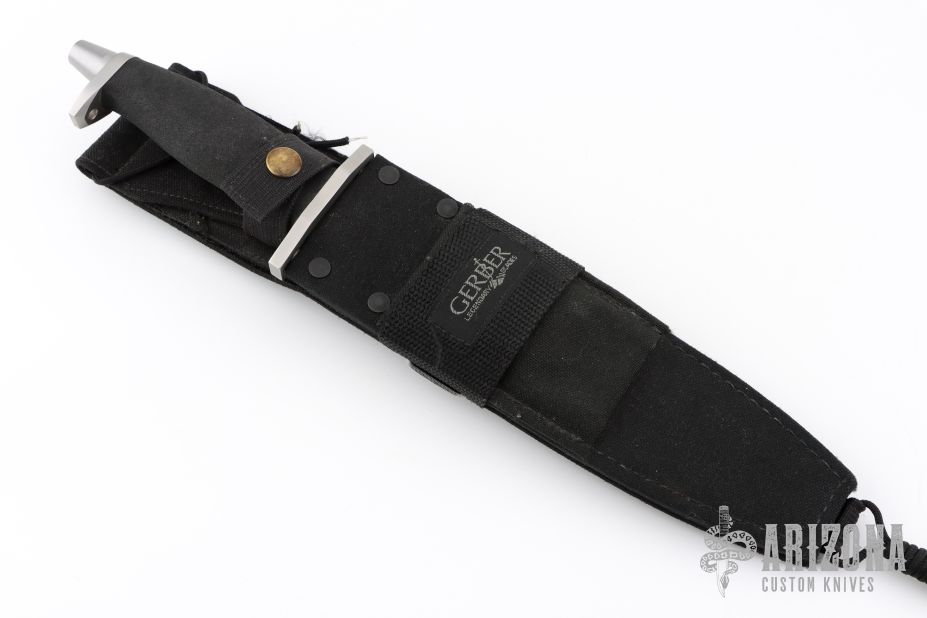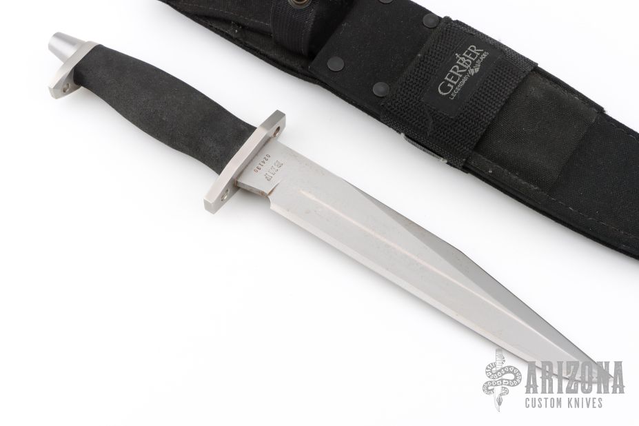 Hard to find BMF by Gerber has been out of production for a number of years. The blade is matte finished as are the guard and butt cap. .243" thick and 1.459" deep. Non-skid handle. Comes with a black nylon sheath with compass in front pocket and a hidden sharpening stone on the back of the sheath. Has some scuffs and scratches, has been resharpened, otherwise good condition. #024130.