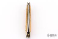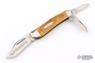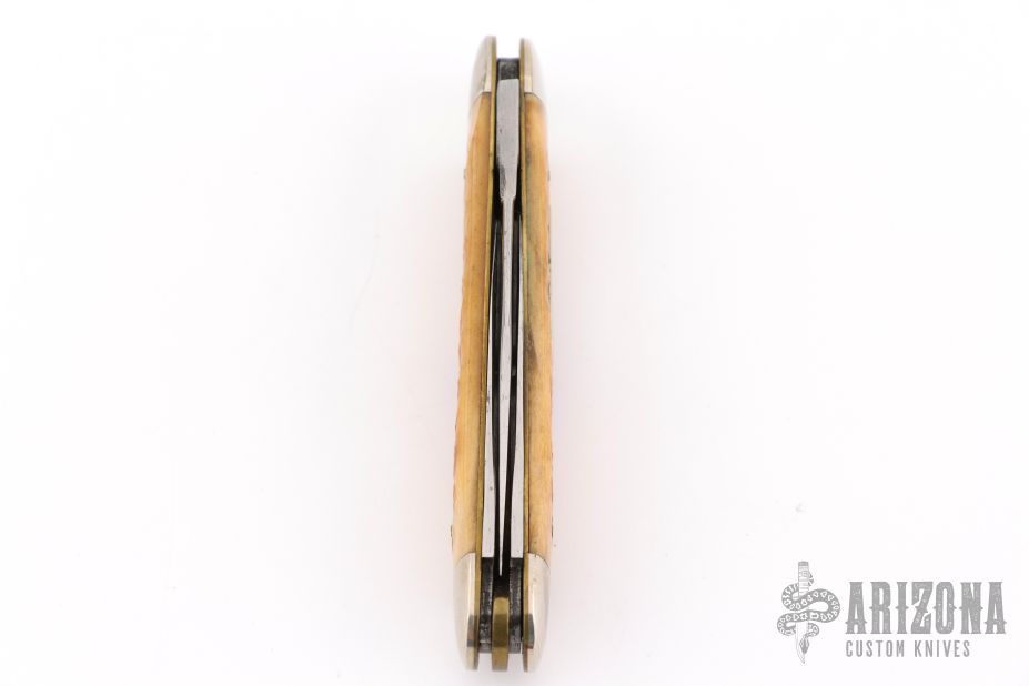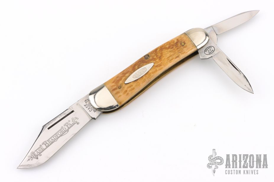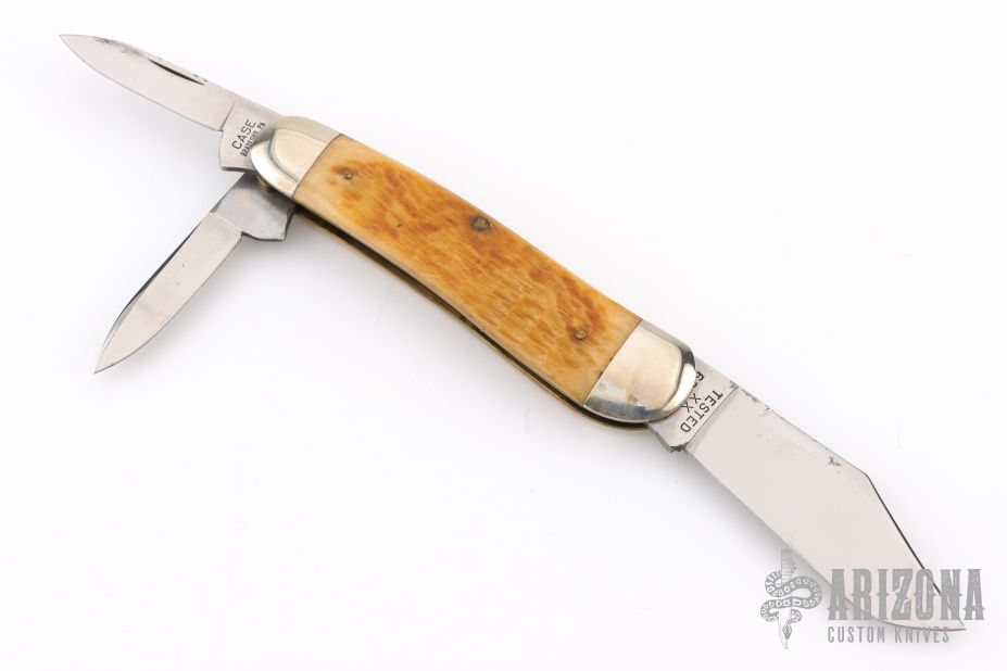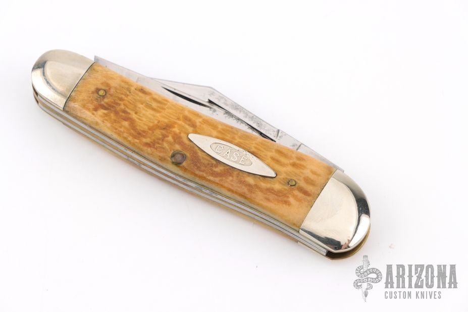 This Three blade slipjoint by Case has mirror polished blades with nail nicks, "W.R. CASE & SONS" on the blade. The handle has nickel silver bolsters, honey jigged bone covers, brass liners and steel springs. Dated 1992. Has some scuffs and scratches, good condition otherwise.