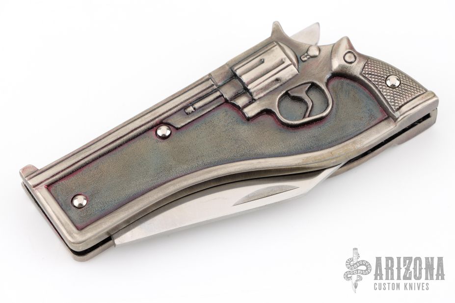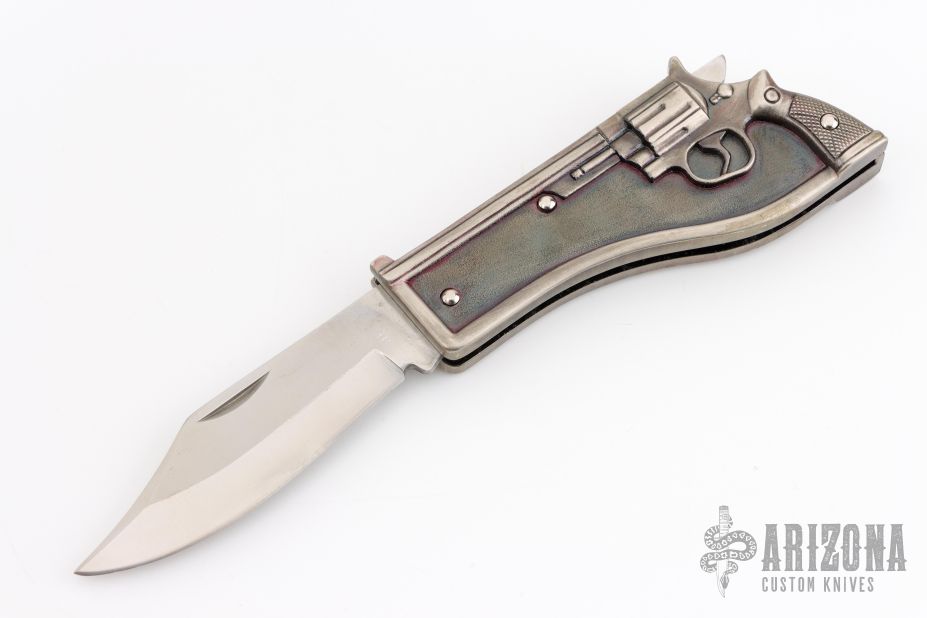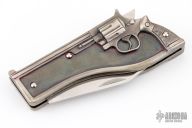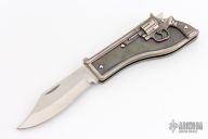 This lockback by JA Henckels features a satin finished blade with nail nick. The handle has a nickel frame in the shape of a revolver, stainless steel backspacer. Excellent condition.
