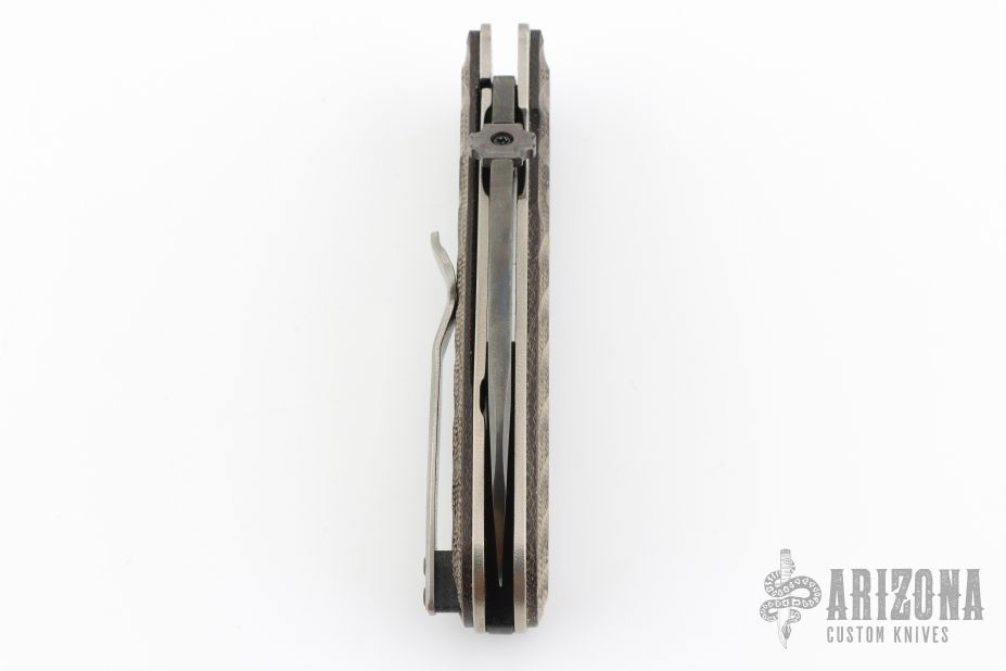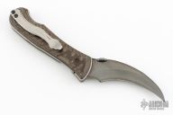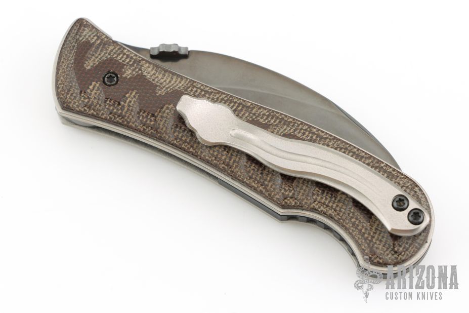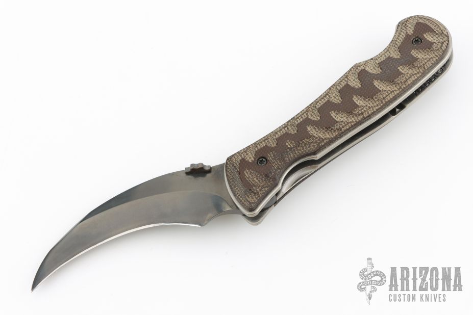 This Elvia Folder by Korth Cutlery features a DLC hawkbill blade with thumbdisc. The handle has micarta scales, orange peel finished titanium liners and a tip up titanium clip with g10 backspacer. Comes with Velcro case. Rides on IKBS, nice detent, lockup and blade seating. Excellent condition.