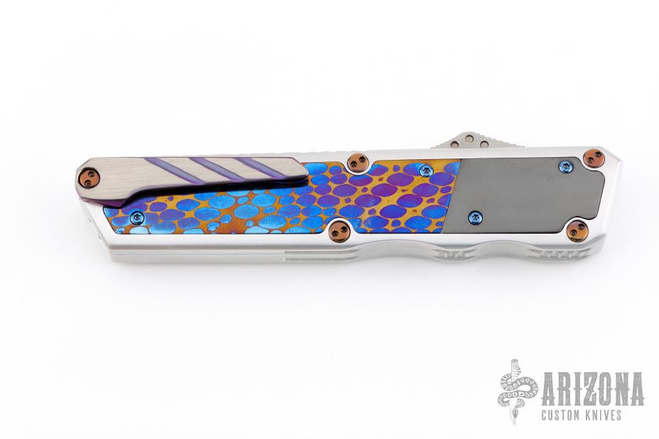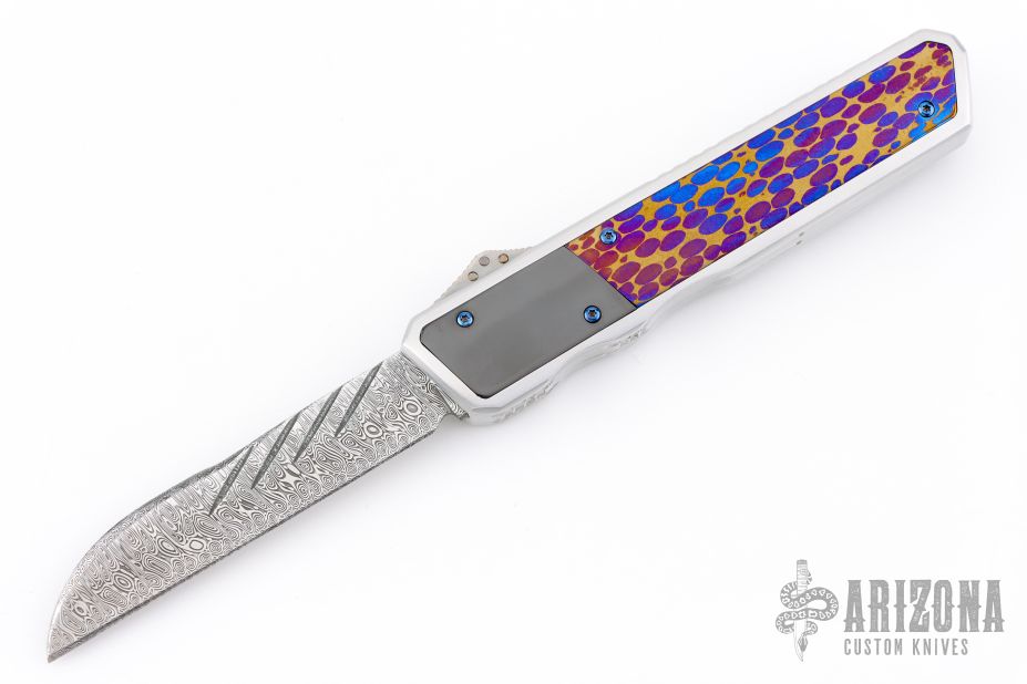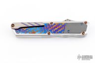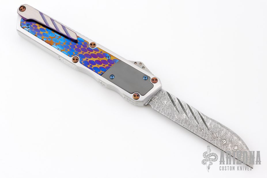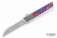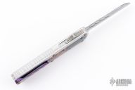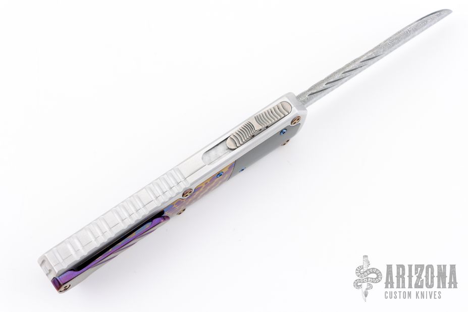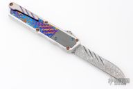This OTF by Patrick Famin features a Damasteel sheepsfoot blade.  The handle features an aluminum frame with zirconium and damtanium inlays.  Titanium pocket clip.  Includes COA and a padded zippered case.  Light scratches visible on the inlays otherwise the knife is in Excellent Condition.