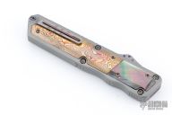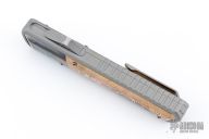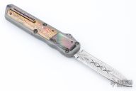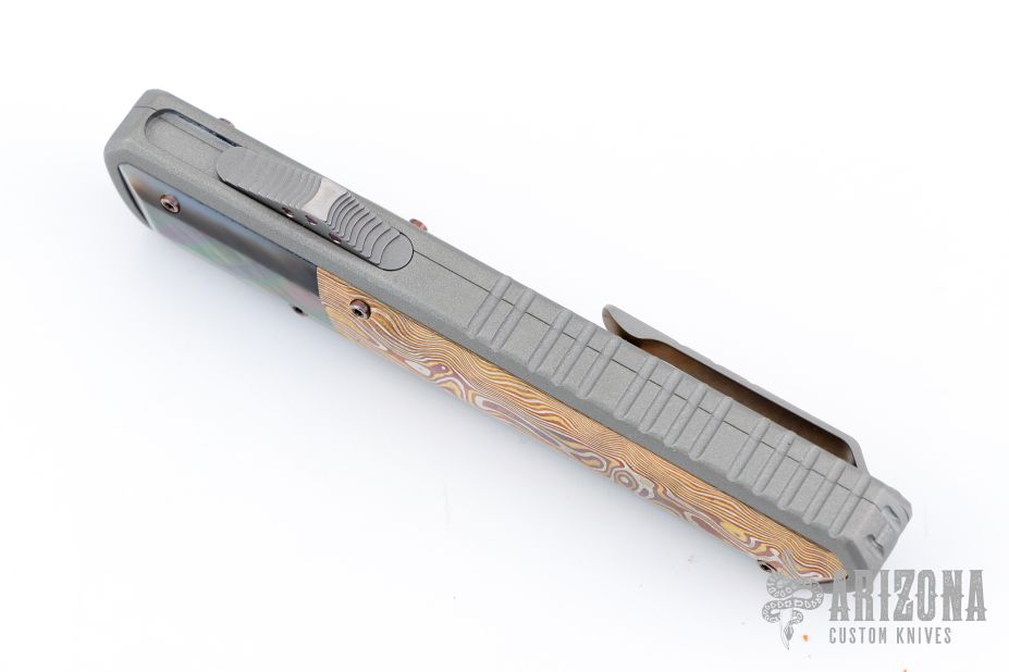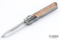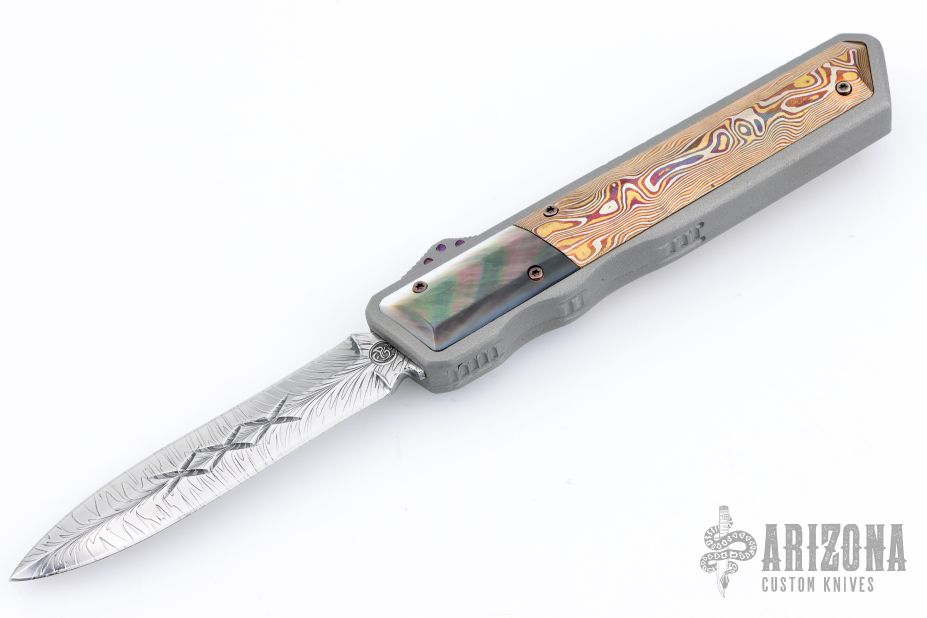 This OTF by Patrick Famin features a stainless feather pattern Damascus blade.  The handle features an aluminum frame with black pearl and mokume inlays.  Stainless pocket clip.  Includes COA and a padded zippered case.  Light scratches visible on the inlays otherwise the knife is in Excellent Condition.
