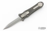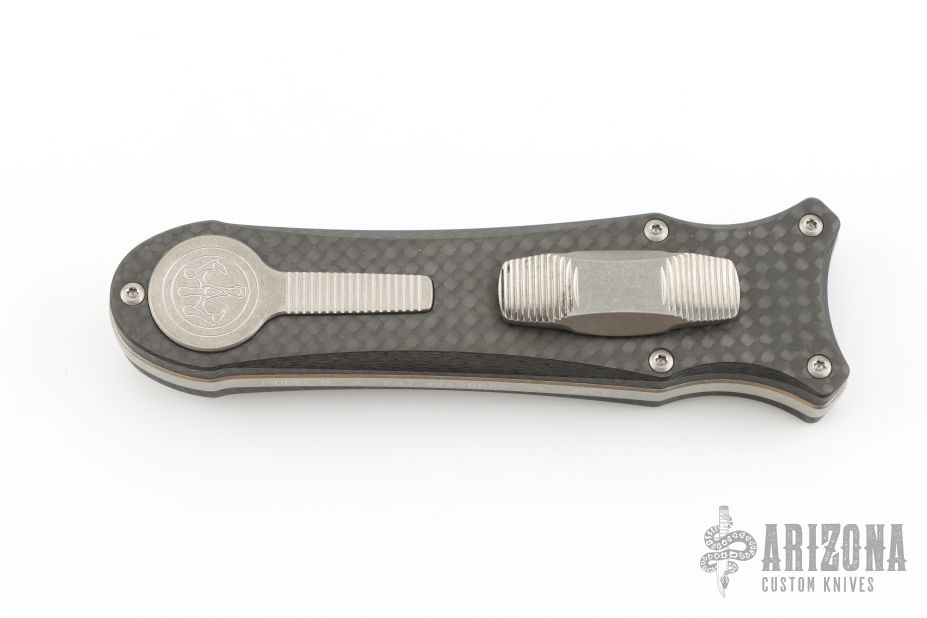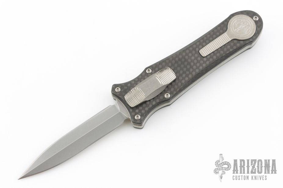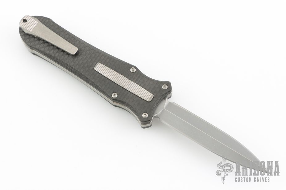 This knife is a Deadlock Model B. It has a double-edged stonewashed blade. The handle has a carbon fiber and stonewashed titanium frame with a tip down spring clip, stonewashed titanium. The thumb slide on the handle is also titanium and handle has titanium overlays. Grant and Gavin Hawk set out to create a double action OTF with no blade play.... They did it, NO blade play. Comes in a soft pouch. Has a couple light scuffs, otherwise Excellent condition.