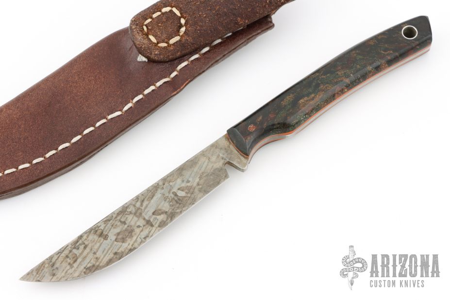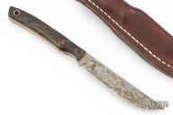 This Bird and Trout by McMurtrey Knives features a hollow ground blade with a forced patina finish, .119" blade stock and .706" blade depth, full tang construction. The handle has vintage rag micarta scales with orange liners, lanyard hole in the butt. Comes with a brown leather sheath. Excellent condition.