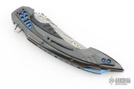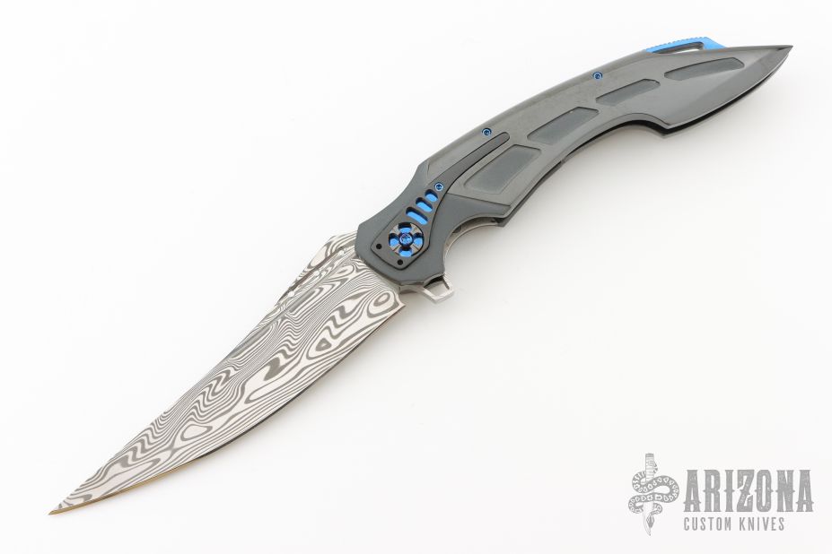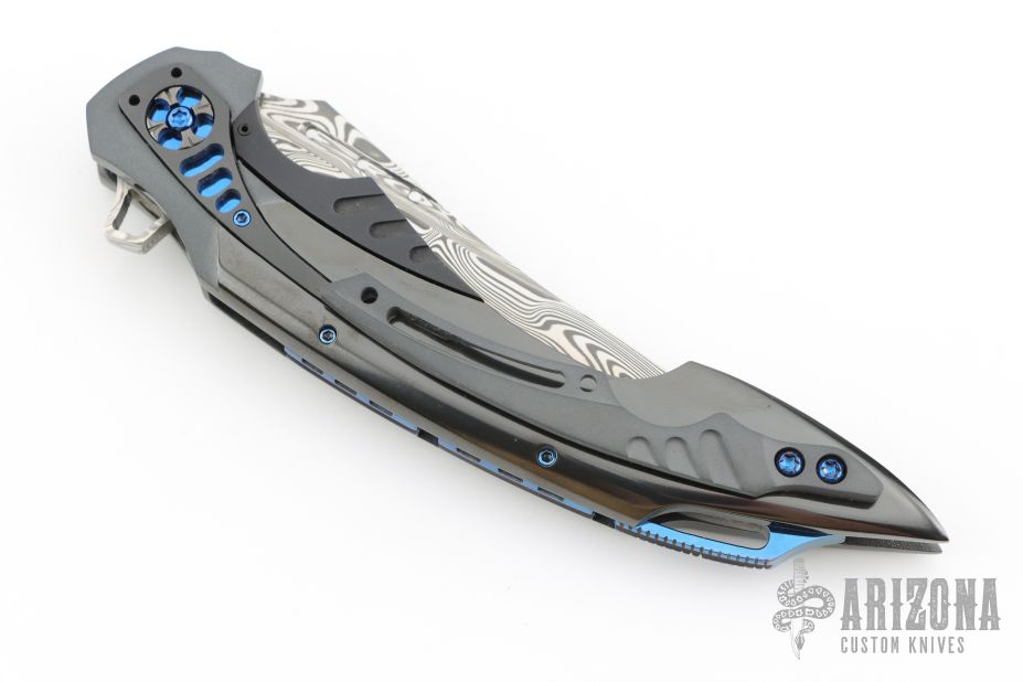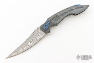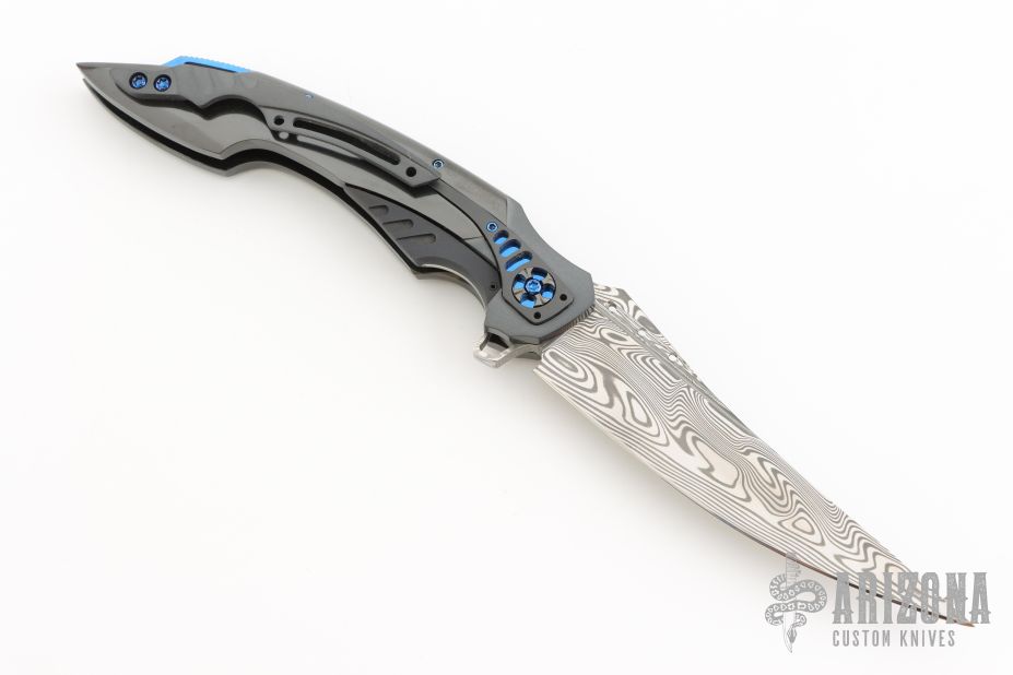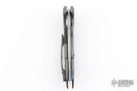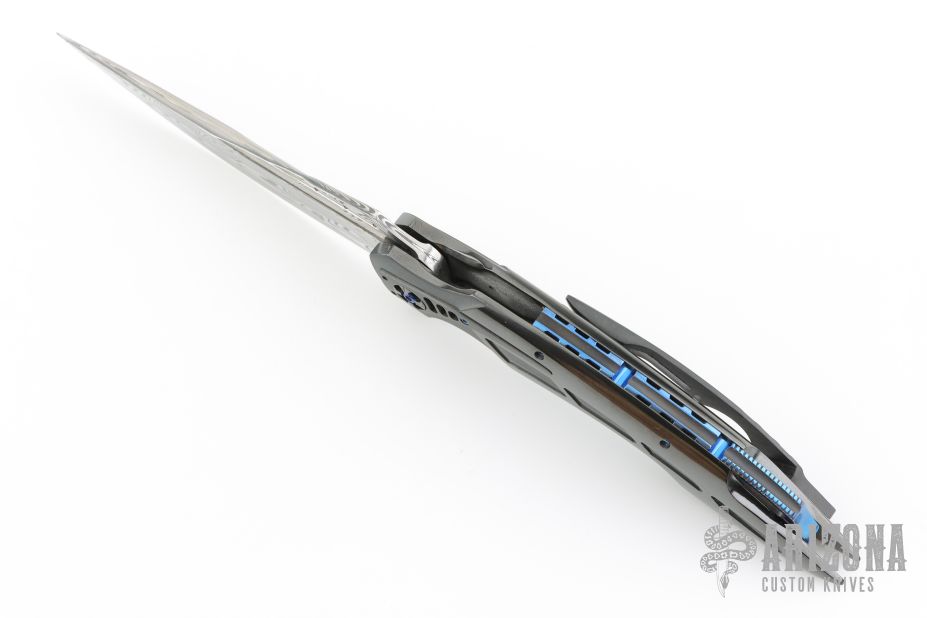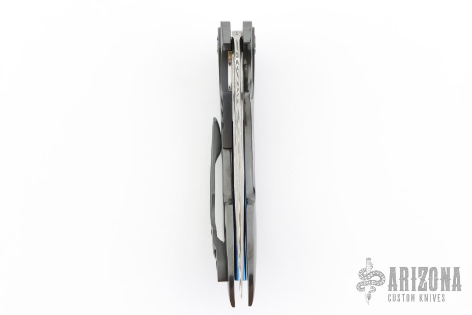 This Curv Flipper by Ron Best features a Damasteel blade with flipper. The handle has a two-tone bead blast/polish finished frame with anodized titanium backspacer, tip up titanium clip, zirconium pivot collars, anodized titanium hardware. Rides on bearings, nice detent, lockup and blade seating. "Ron Best 2-18-21" inside the frame. Comes with original box. Excellent condition.