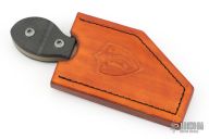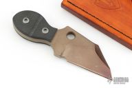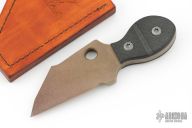 This Plan C from Mr. Horton features a chisel ground blade with swedge, bronzed stonewashed finish, .244" blade stock and 1.570" blade depth, full tang construction. The handle has carbon fiber scales. Comes with a custom brown leather sheath. Excellent condition.