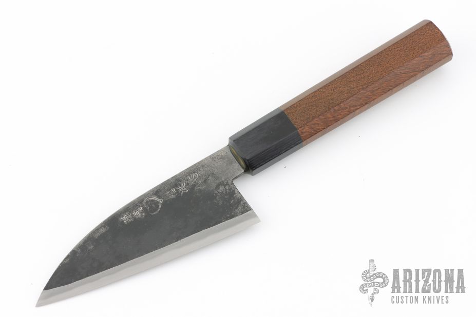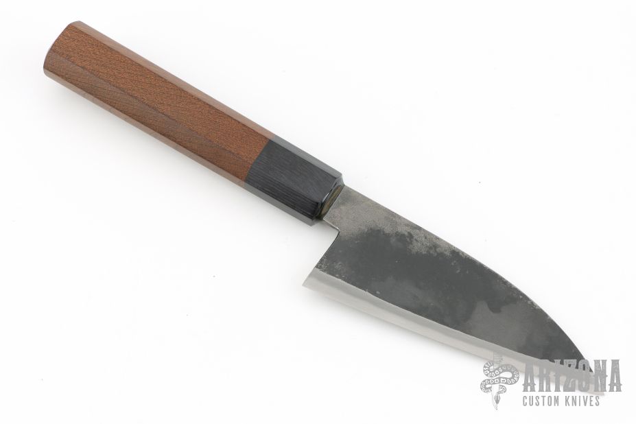 The Banno-KoDeba knife is traditionally used as a paring knife or all-purpose small kitchen knife. The blade is Stainless Clad Aogami Super Steel (NAS) which is a high-carbon steel alloy with vanadium. As with all of Takeda's knives, it has a strong sharp edge. The octagon shaped wood handle is easy to hold. 109mm cutting edge, .154" blade stock and 1.588"