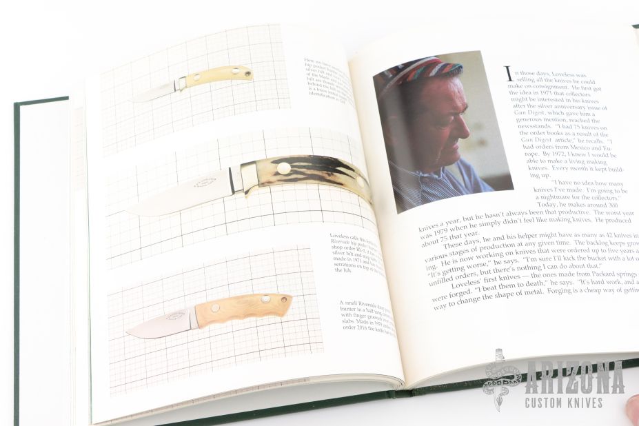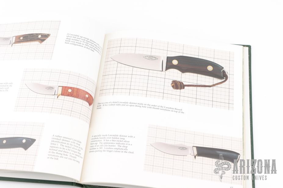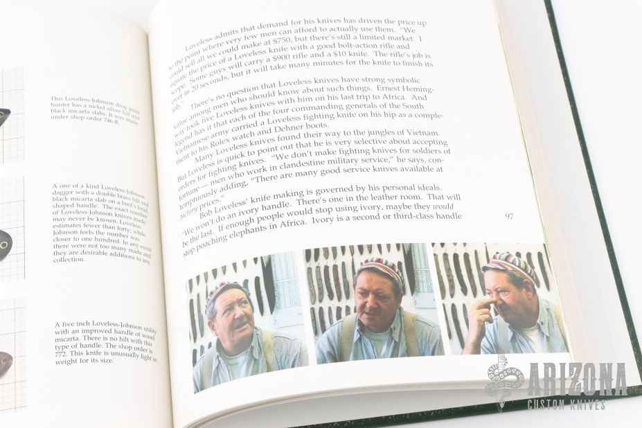 The result of my efforts is on the following pages which also trace the Loveless career from Claymont, Delaware in 1954 to the stacked leather washer handles of the Delaware Maids, and then, to the latest Riverside integrals of 1989. Illustrated by Jim Weyer. Square quarto, gilt-stamped green cloth, 128 pages plus a 32-page section of Japanese text. From front to back, this book is filled with beautiful, full-color photographs (many full-page size) of the works of one of the custom knife world's most accomplished artisans as Robert W. Loveless calls himself. Mainly, it is a study of the varied markings used on Loveless-made knives, reflecting his partnerships as well as the passage of time, from the early 1950s in Delaware to the modern creations from Riverside, California today.