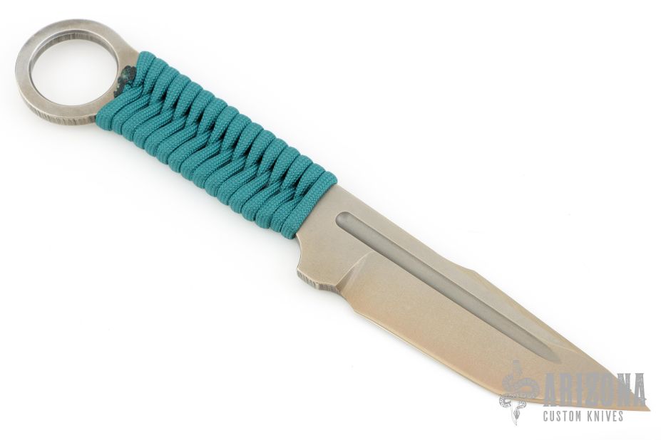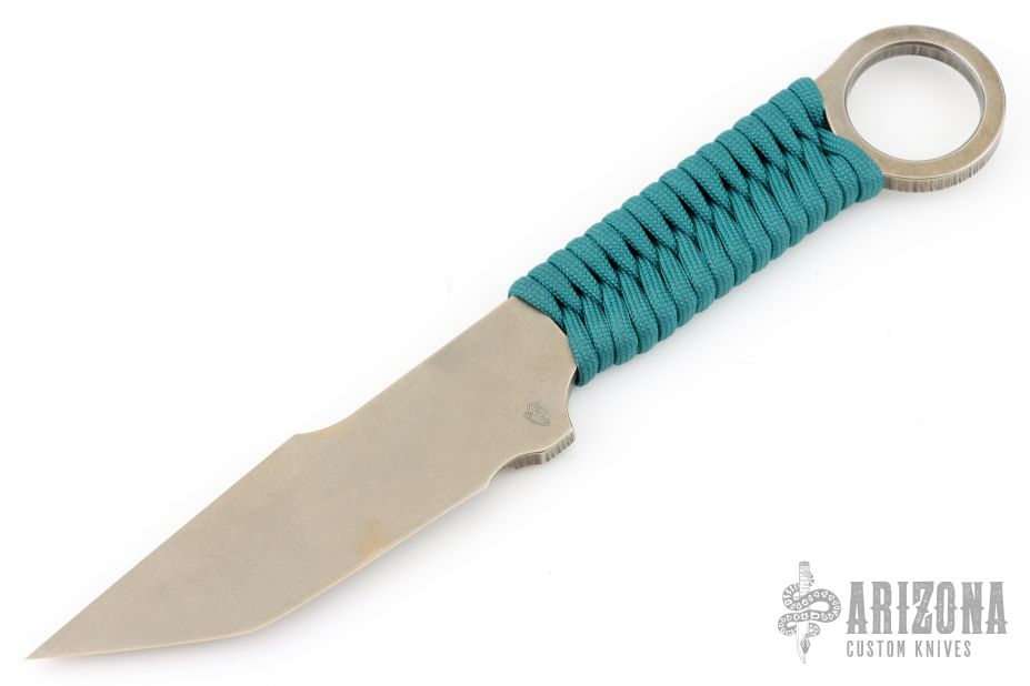This Ringed Survival Shawty by Jeremy Horton features a very lightly bronze DLC coated and tumble finished chisel ground blade with mirror polished tip and a fuller, .205" blade stock and 1.142" blade depth, cord wrapped grip. Excellent condition.