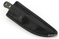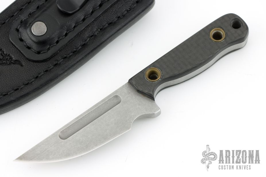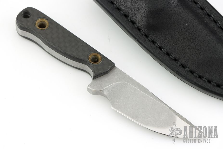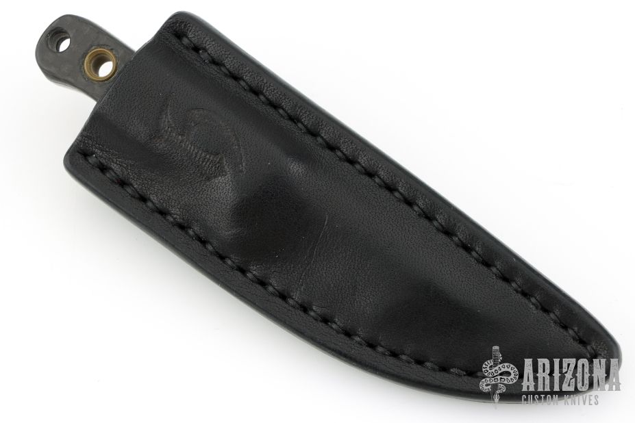 This knife by Jeremy Horton features a tumbled chisel ground blade with swedge, .194" blade stock and .787" blade depth, full tang construction. The handle has carbon fiber scales with flanged brass tub pins. Comes with a brown leather sheath. Excellent condition.