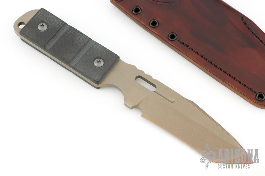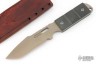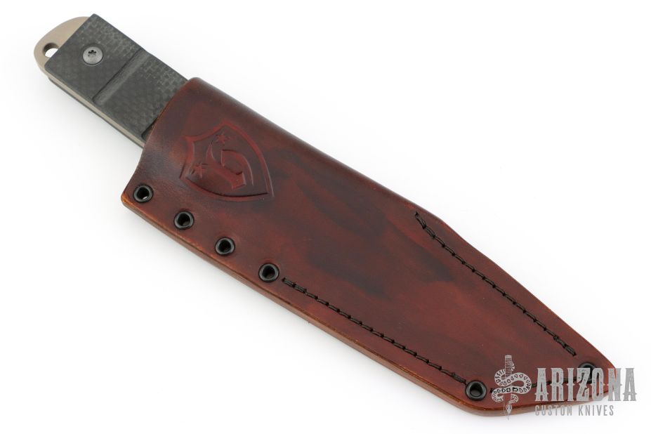 This knife by Jeremy Horton features a bronzed and tumbled chisel ground blade with swede and notched thumbrest, .187" blade stock and 1.348" blade depth, full tang construction. The handle has carbon fiber scales with lanyard hole. Comes with a brown leather sheath. Excellent condition.