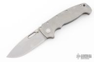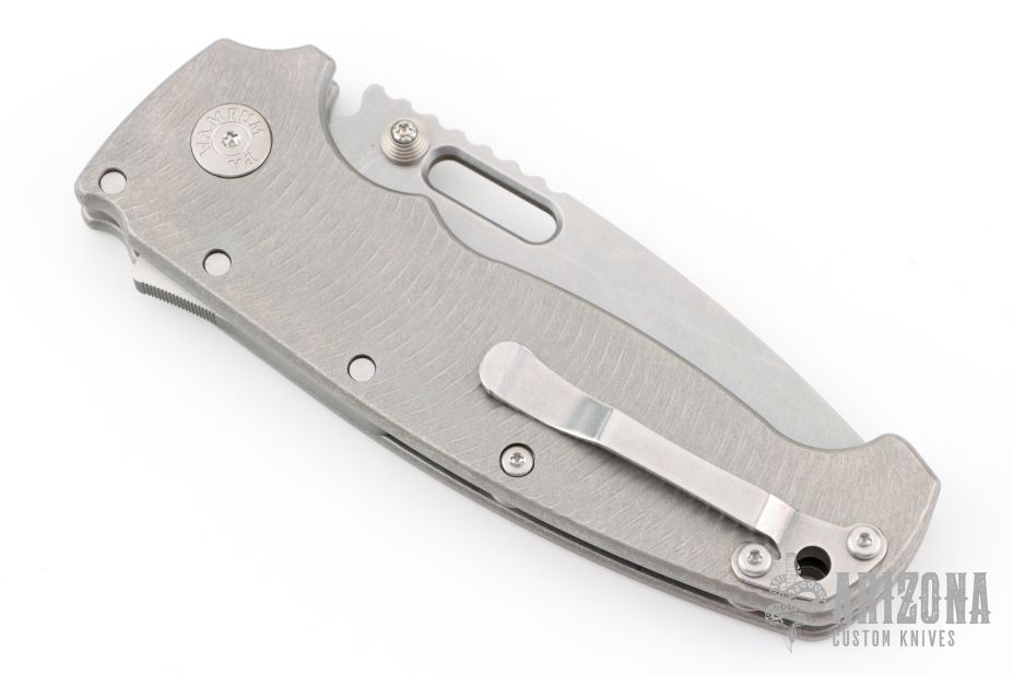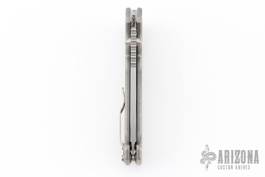 This AD20 XL by Andrew Demko features a tumble finished blade with notched thumbrest and dual thumbstuds.  The handle has a textured/bead blast finished titanium frame with a tip up titanium clip and "Shark" lock release on the spine. Comes with original box and zippered case. MagnaCut Blade. New from maker!