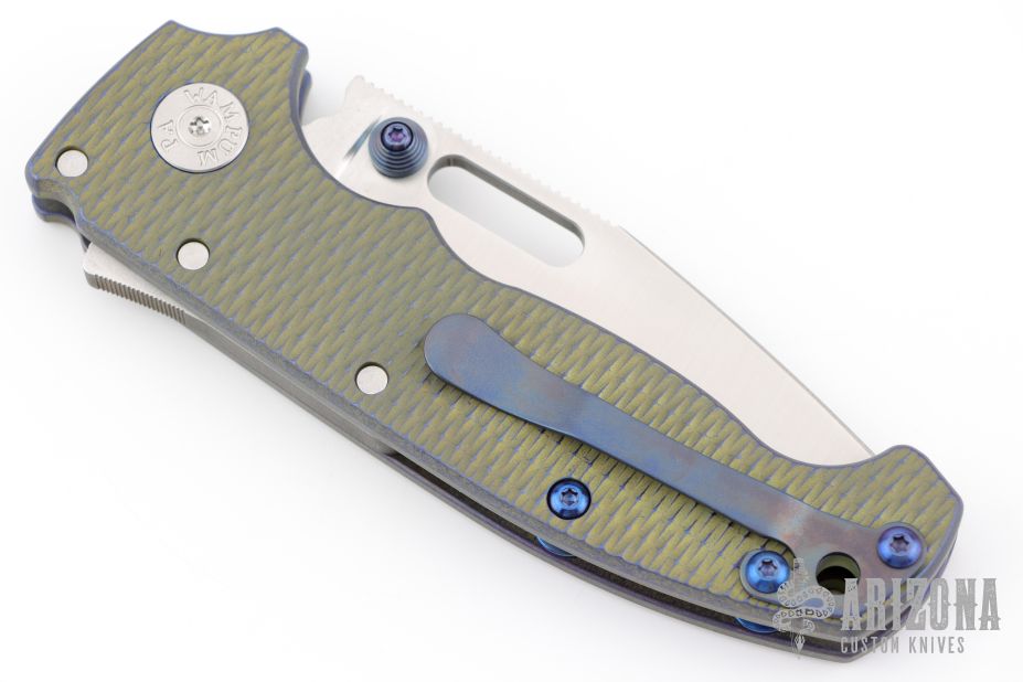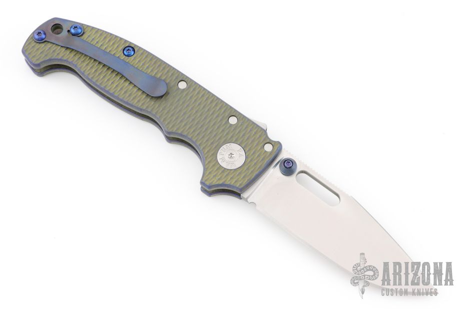 This AD20 by Andrew Demko features a hand ground hollow satin finished blade with notched thumbrest, thumbhole and dual thumbstuds.  The handle has an anodized titanium frame with a tip up anodized titanium clip and "Shark" lock release on the spine. Comes with original box and zippered case. MagnaCut Blade. New from maker!