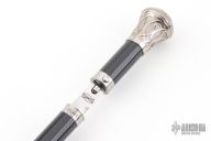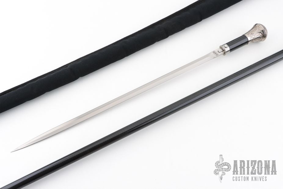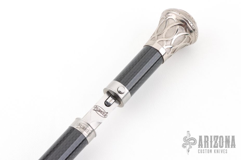 This beautiful cane by Burger Knives features a double edged hand rub satin finished blade with engraved/textured handle, .192" blade stock and .560" blade depth, hidden tang construction. The cane has a woven carbon fiber shaft.The dagger locks into the cane with a spring loaded lock, press the button to remove, and sheath the blade until it clicks, to return it to the cane. Very secure. Excellent condition. Very classy piece. Comes with a nylon case for the cane.