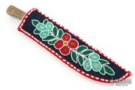 This Trade Knife is made from a file, satin finished grinds and forge finished flats, .172" blade stock and 1.327" blade depth, full tapered tang construction. The handle has pewter bolsters, curly maple scales with steel pins. Comes with a deer hide sheath with beaded front. Has some light scratches and patina, otherwise excellent condition. It is intended to have an antiqued look and finish.
