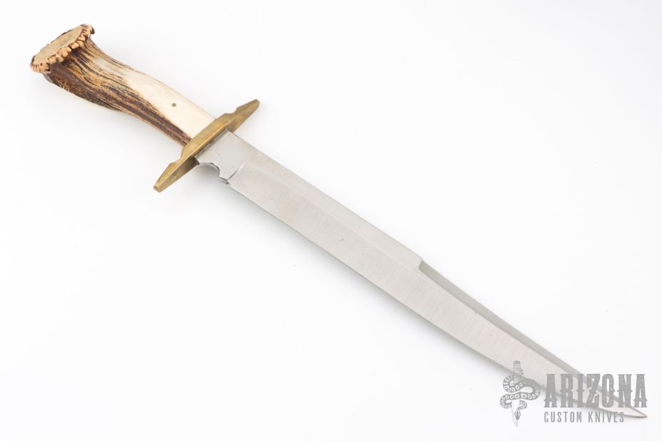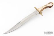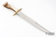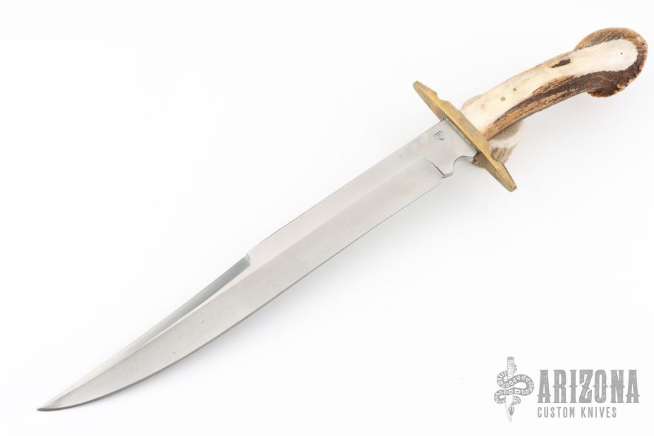 This Large Fighter by Jim Hrisoulas features a satin finished blade with false top edge, .232" blade stock and 1.483" blade depth, hidden tang construction. The handle has a brass guard with a crown stag grip with a single brass pin. Has a couple light scratches, otherwise excellent condition.