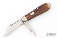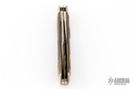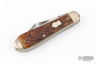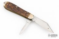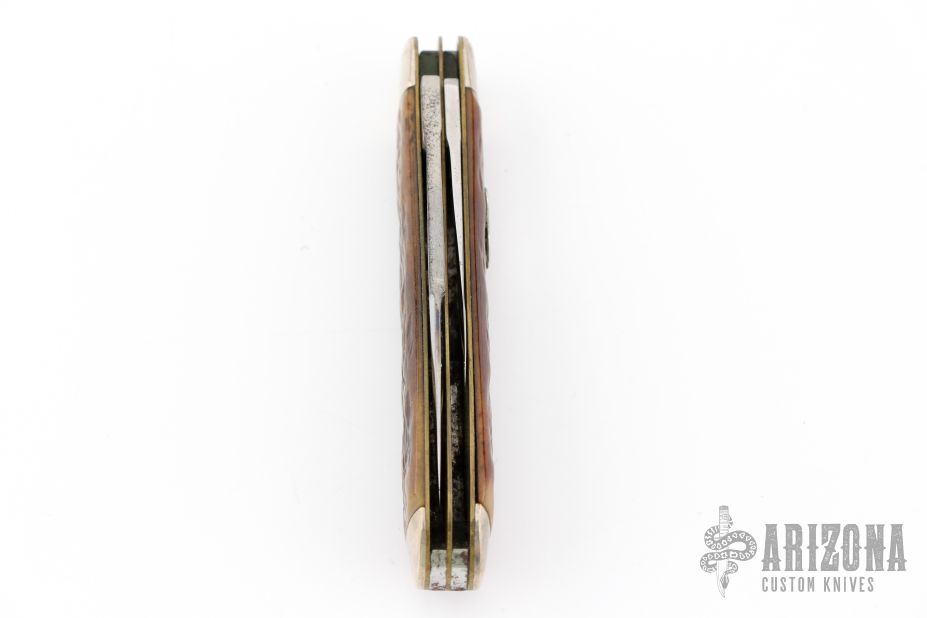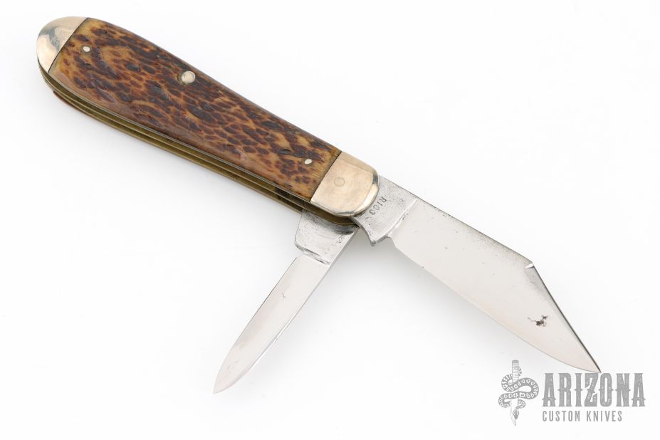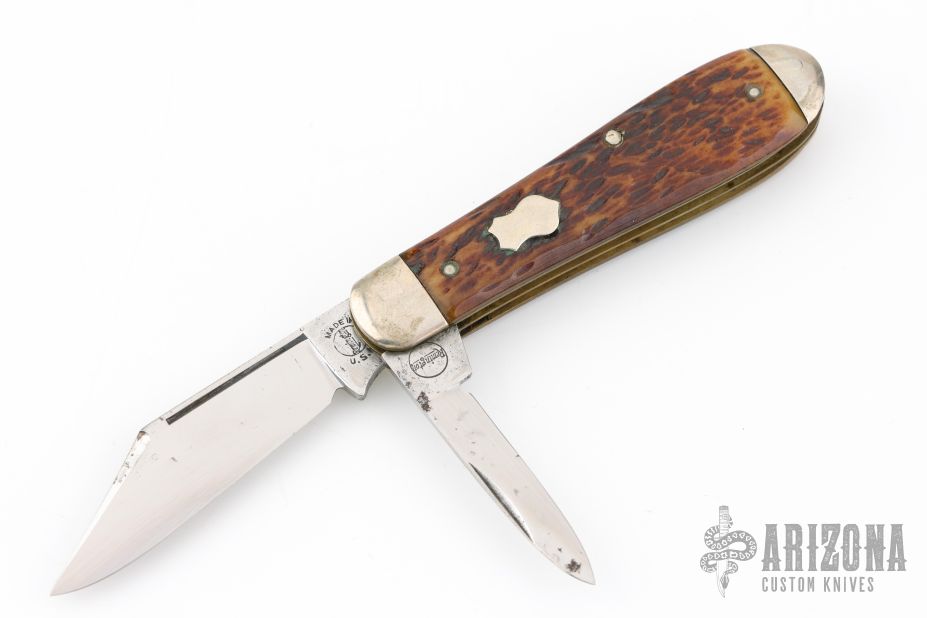 This slipjoint by Remington Knives features a mirror finished blades with nail nick and longpull. The handle has nickel silver bolsters, stag covers with a nickel silver escutcheon, brass liners and stainless steel spring. Has scuffs, scratches, and patina. Great condition for its age; and otherwise.