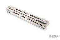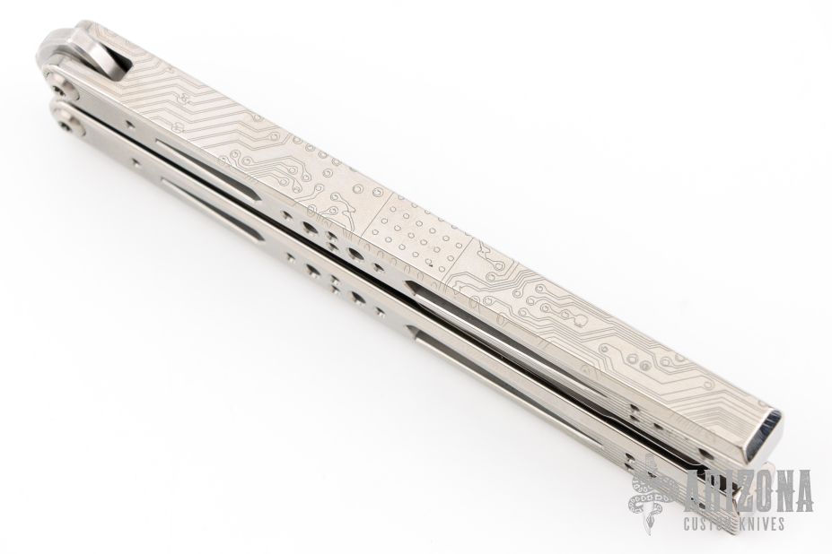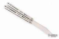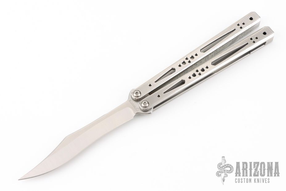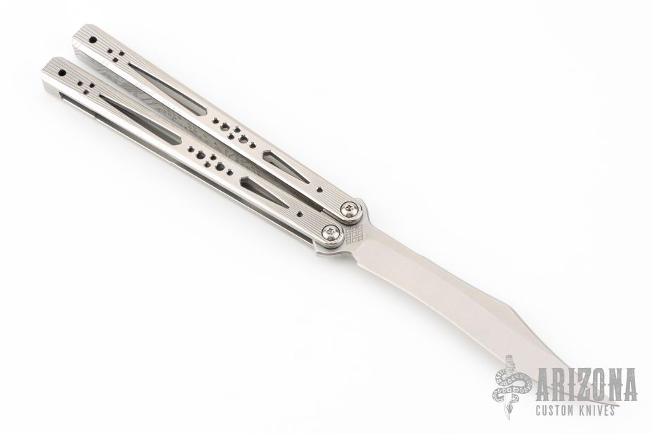 This Ryworx Bali-Song features a tumbled clip point blade with a false top edge. The handles are composed of bead blasted titanium. Includes the original box. Excellent Condition.