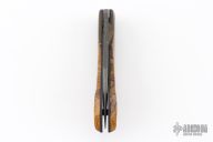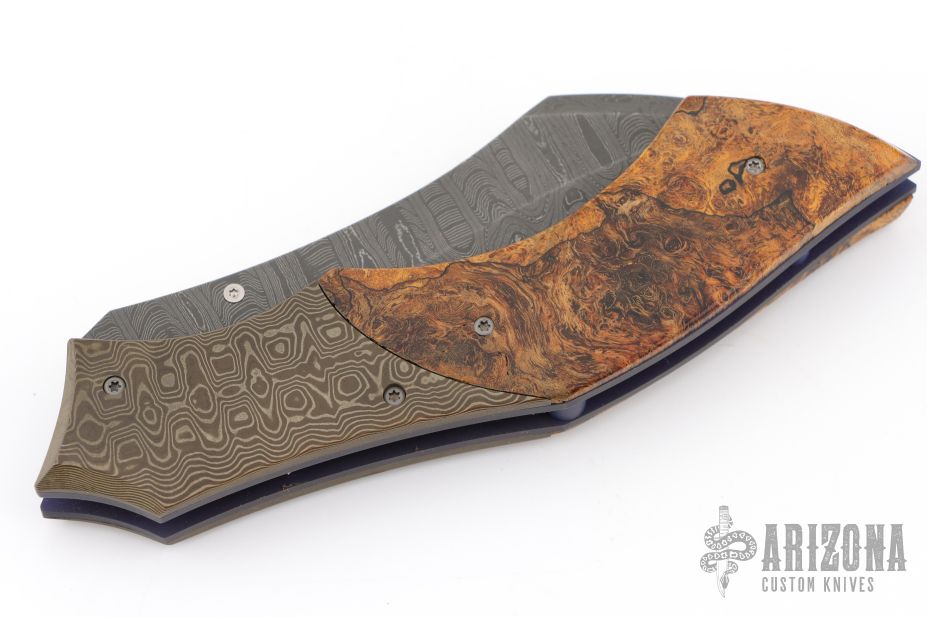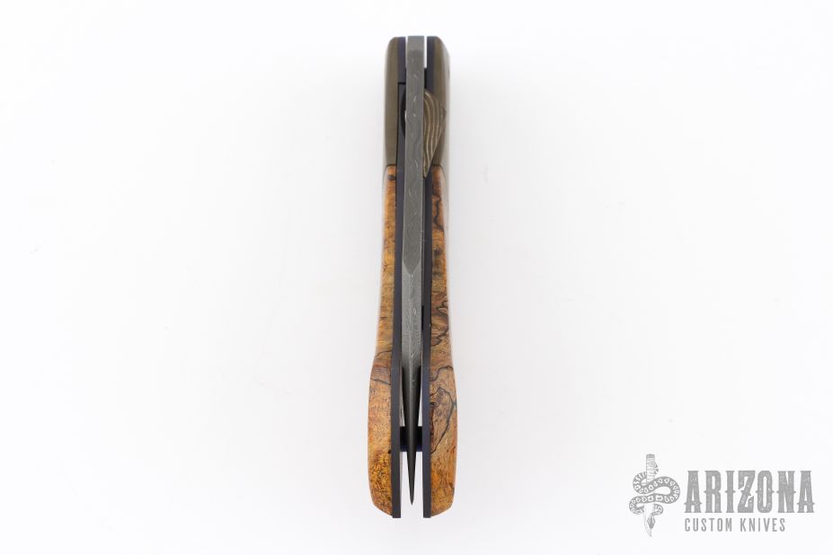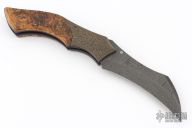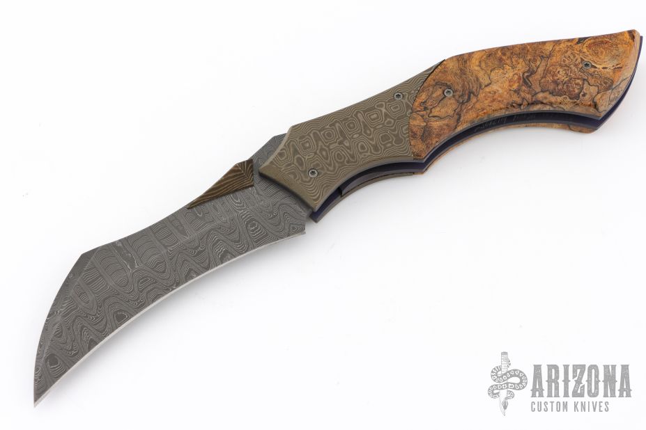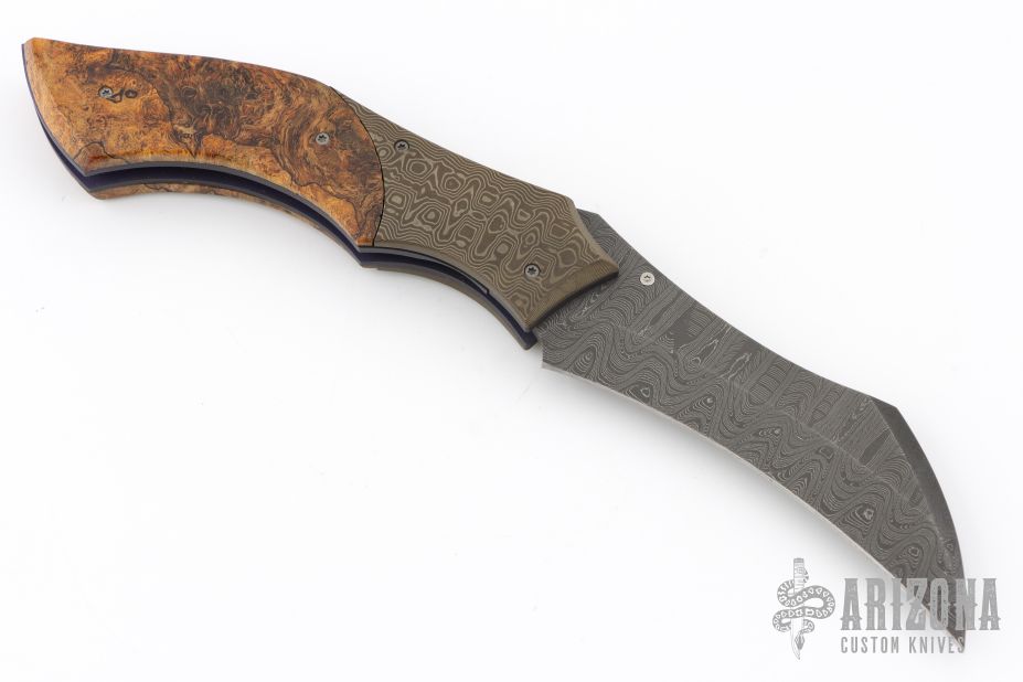 This Assassin Liner lock by Jeremy March features a Damascus hawkbill style blade with a mokume thumb lug. The handle has mokume bolsters, spalted burl wood scales, bead blasted and anodized titanium liners. Nice work. Strong lock up, nice detent and blade seating is dead center. Nice attention to detail. Excellent condition. Comes with a zippered case.
