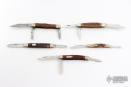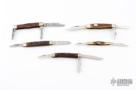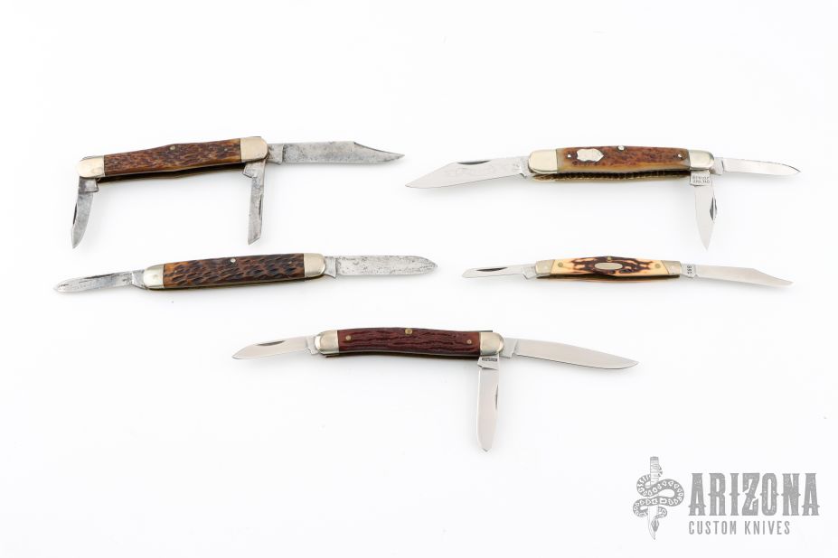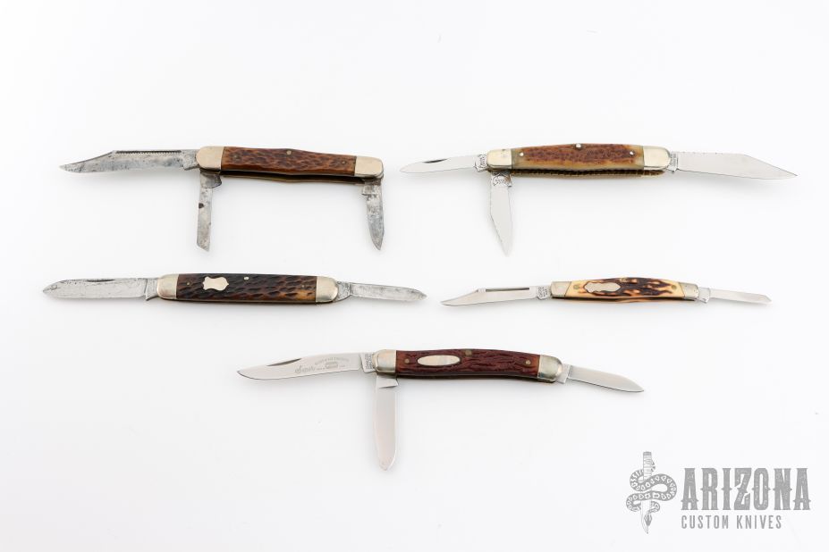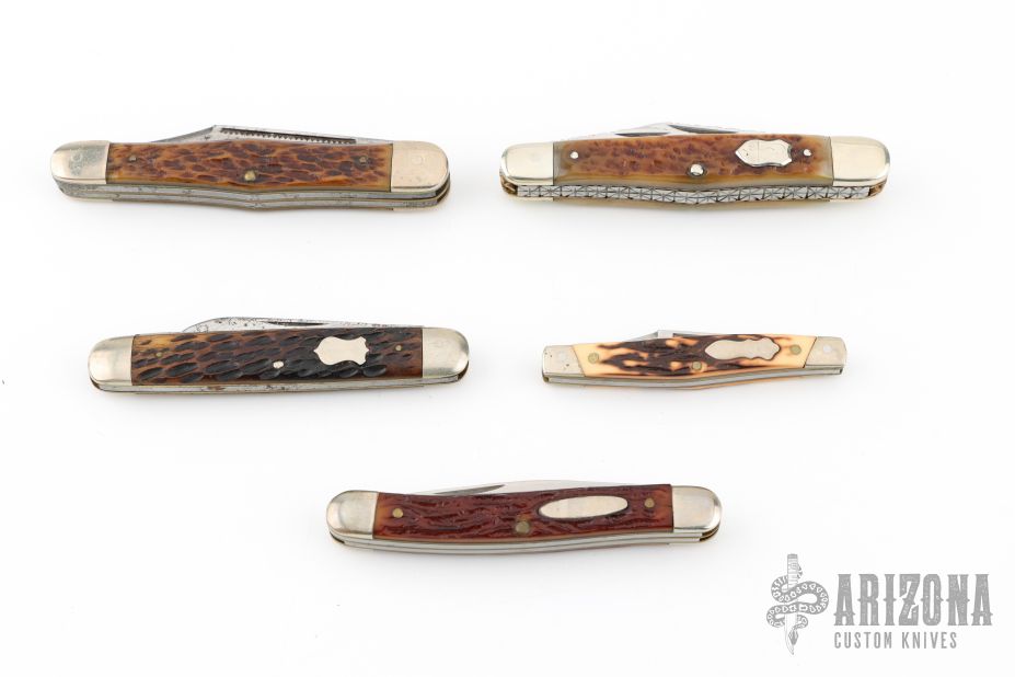 These knives have polished blades, jigged bone covers, nickel silver caps, brass liners, steel springs, and shields. Has scuffs, scratches, and patina. Good condition for their age.