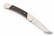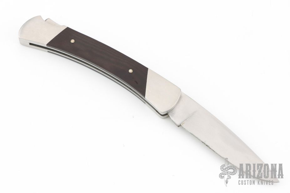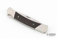 This Buck Custom 501 features a satin finished blade with nail nick. The handle has nickel silver bolsters with integral liners, G10 inlays and a stainless steel spring. Has a nylon belt sheath. Has some scuffs and scratches, great condition otherwise.