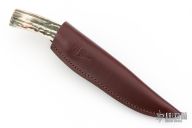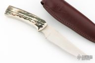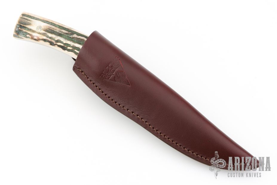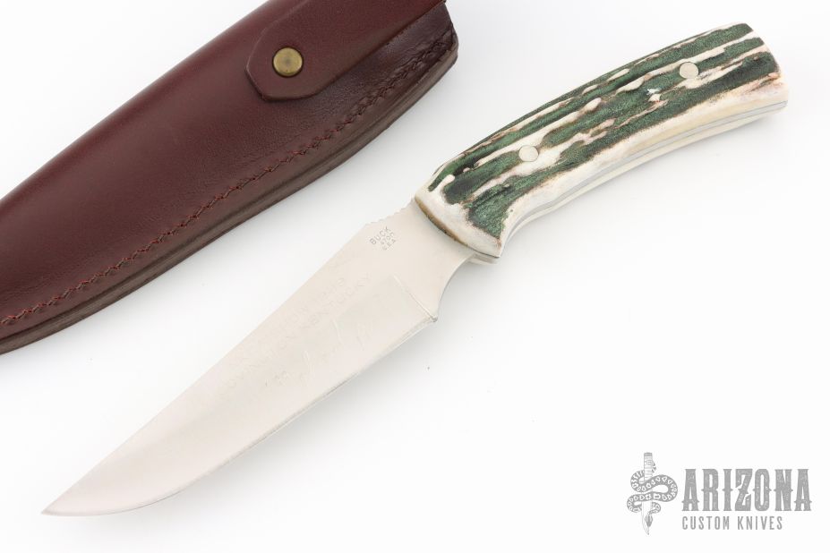 This Buck 470 features a satin finished blade with notched thumbrest, .121" blade stock and 1.373" blade depth, full tang construction. The handle has stag scales. Comes with original box and brown leather sheath. Excellent condition. Signed by Chuck Buck and dated '99. Has "NKCA Show 1999 Covington Kentucky" on the blade.