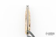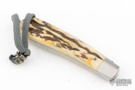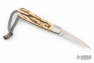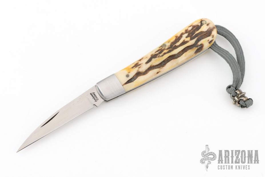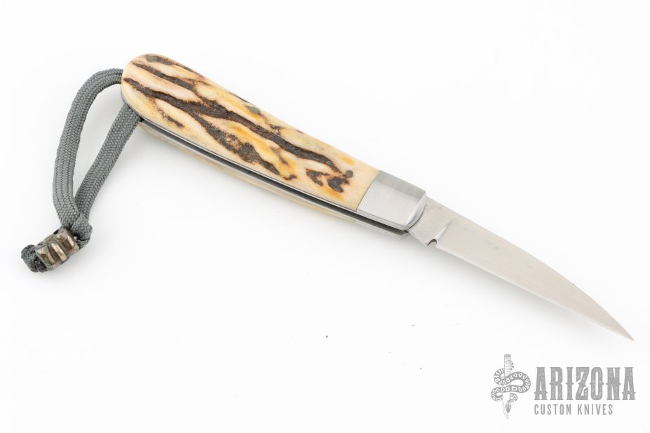 This slipjoint folder by Amherst Cutlery features a hand rub satin finished blade with nail nick. The handle has stainless steel bolsters, stag covers, stainless steel liners and spring. Comes in original box. Has a couple light scratches, otherwise excellent condition.
