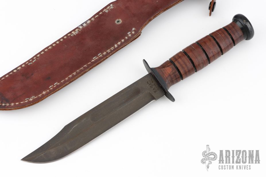 This KA-BAR USMC Fighting Knife has a carbon steel black clip point blade, marked "KA-BAR/ Olean, N.Y. USMC", and steel double guard. Blade stock is .174", depth 1.233". Handle is stacked leather with a 3/8" pinned butt cap.  Includes original box, papers, and brown leather sheath with belt loop. Has some scuffs and scratches, great condition otherwise.