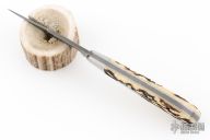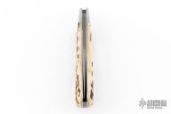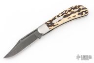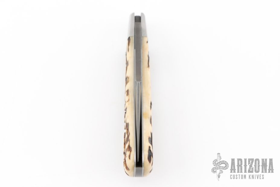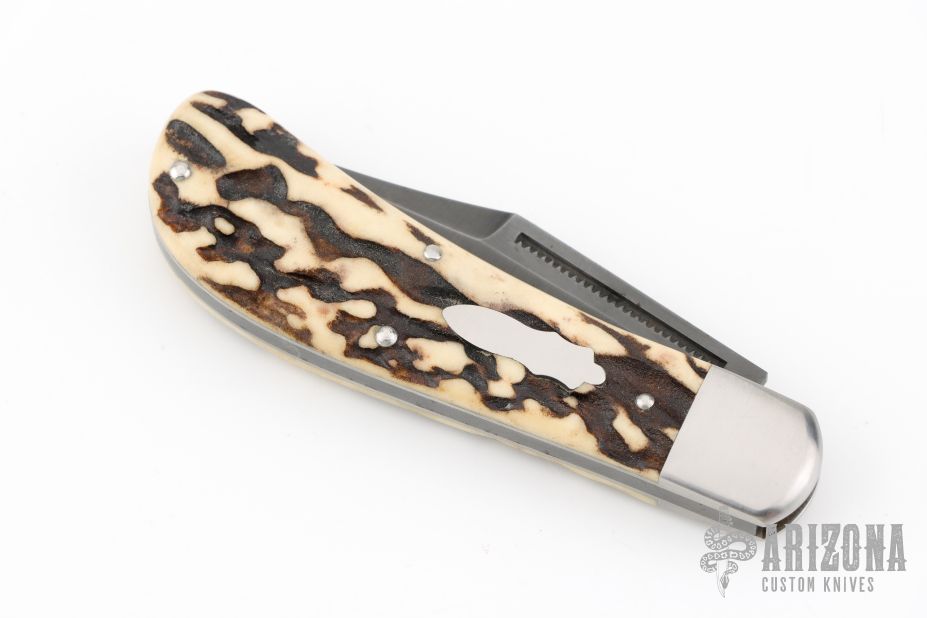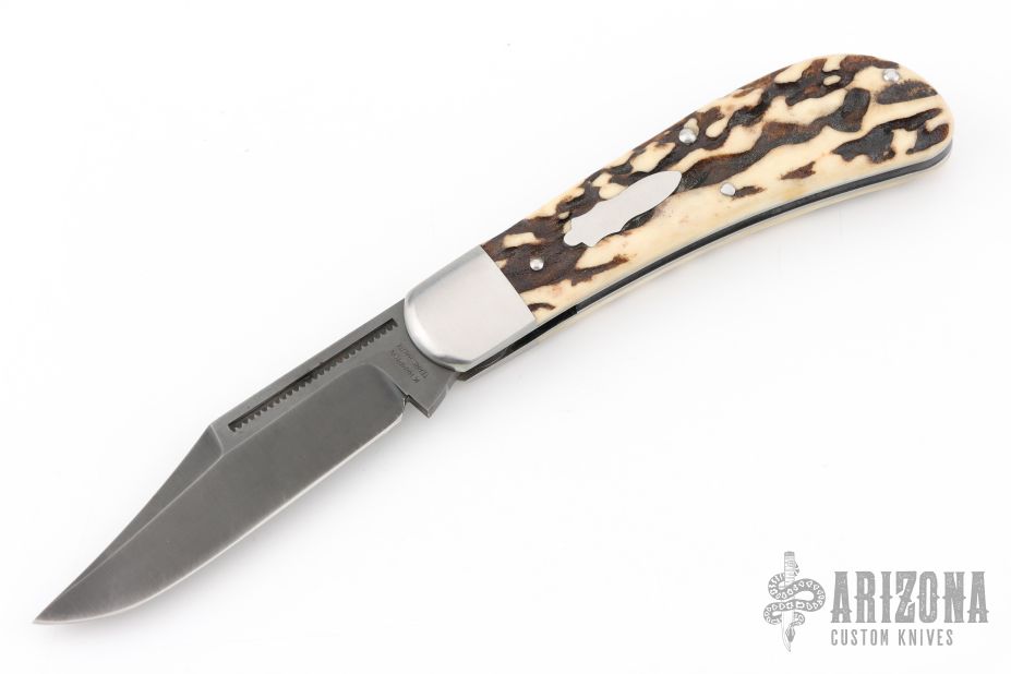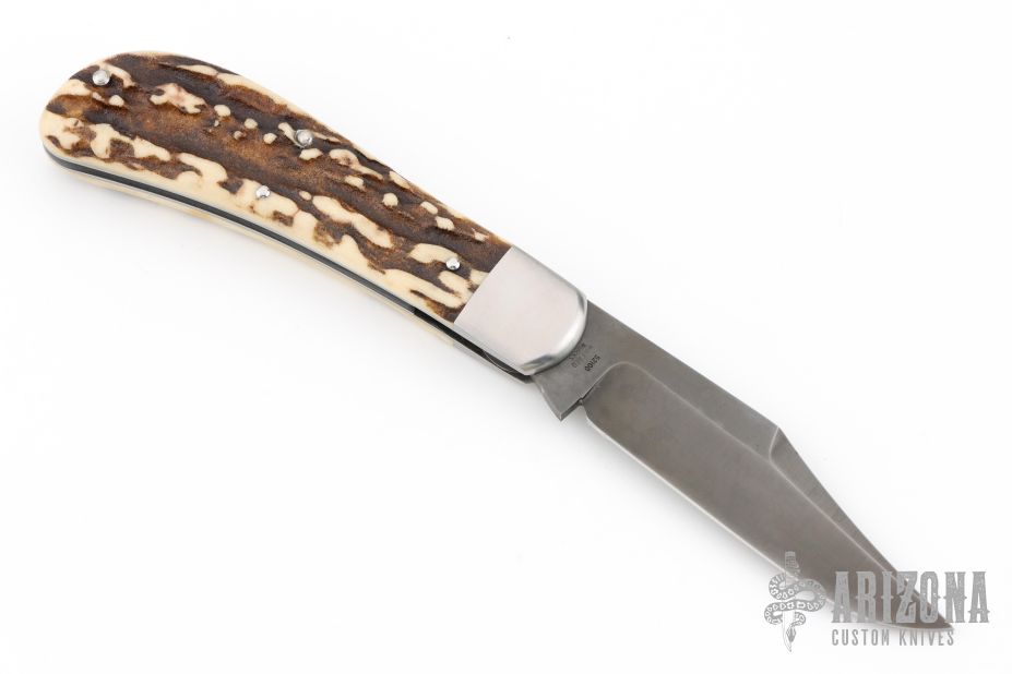 This Lanny's Clip by K. Hampton features a blued 52100 satin finished blade with a long pull. The handle features satin stainless steel bolsters, escutcheon and liners, stag covers, blued stainless steel spring. Has half-stop, flush in all positions. Nice pull! Comes in a Bill's case. Has some patina, and light scuffs. Excellent condition otherwise.