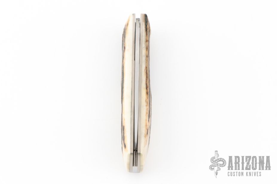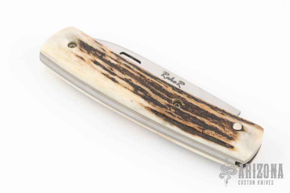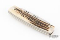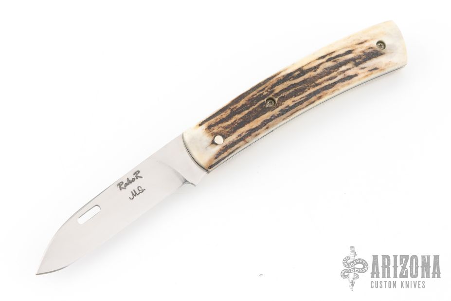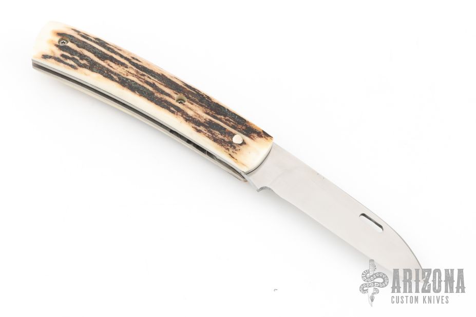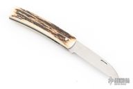This Scagel style slipjoint folder features a forged blade with a hand-rubbed satin finish, and stag covers. Half stop on blade. Opens and closes with a nice snap. Excellent work. Comes with zipper case, maker's card and COA. Has a couple light scratches, and some spotting on the inside of the spring. Excellent condition otherwise.