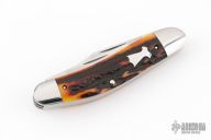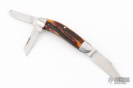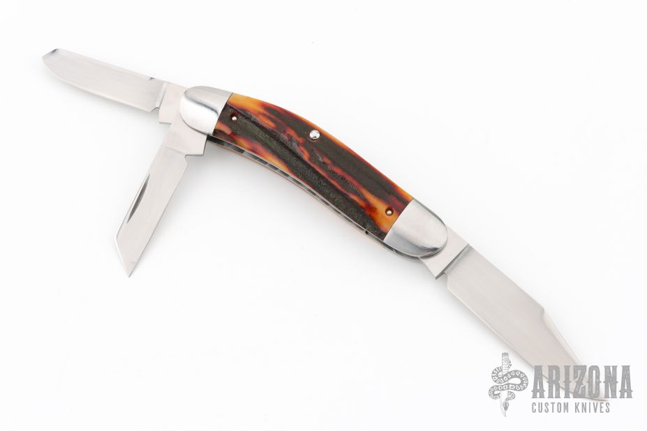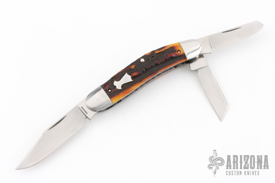 This 3-Blade Sowbelly by Luke Swenson features hand rub satin finished blades with nail nicks. The handle has stainless steel bolsters with integral liners, stag covers, stainless steel escutcheon, springs and liners, has half-stops, flush in all positions. Comes with maker's zippered case. Has a couple light scratches, excellent condition otherwise.