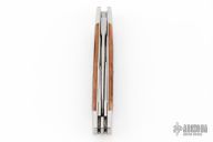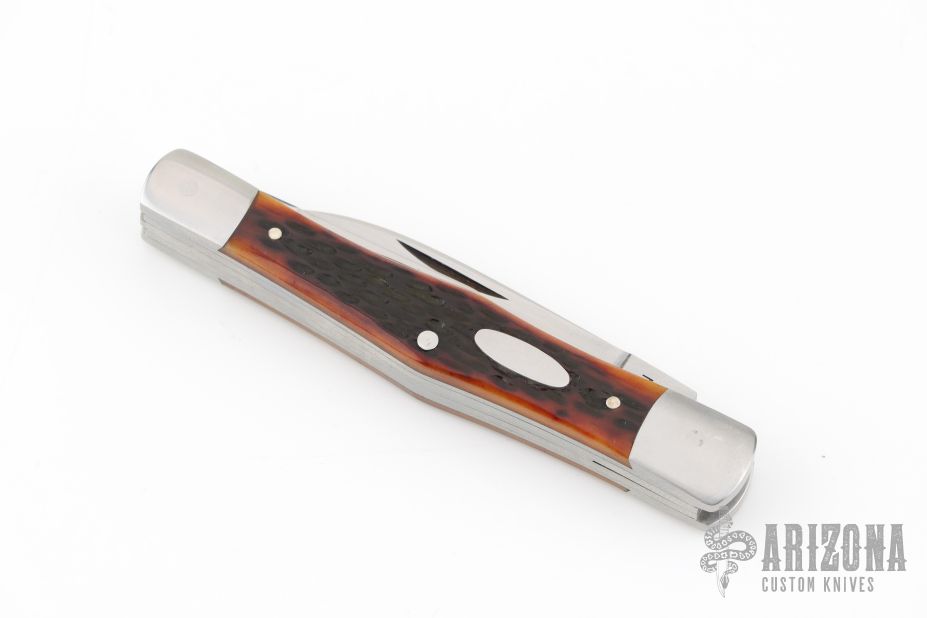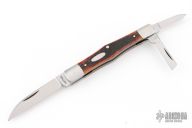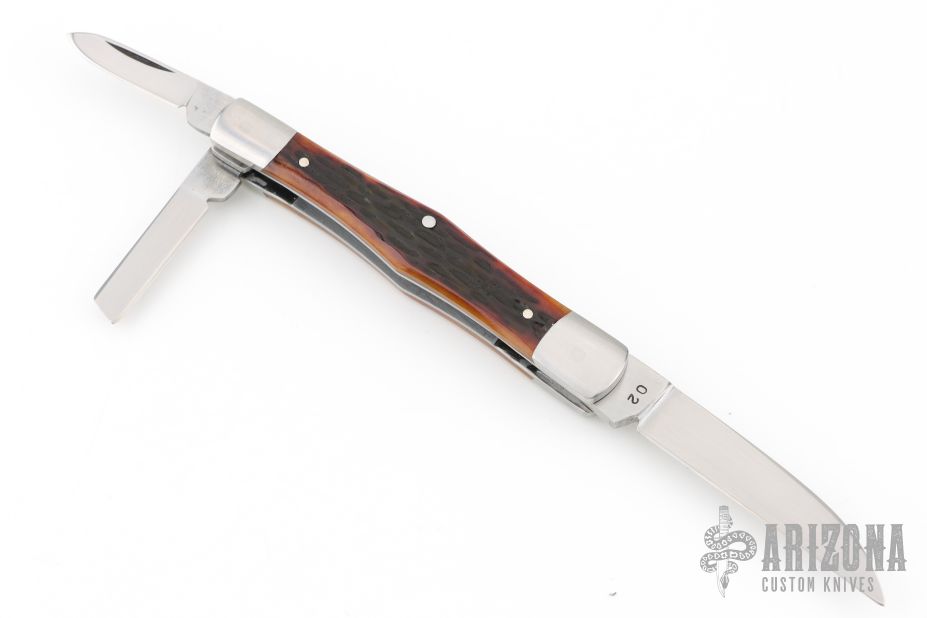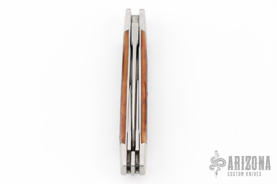 This 3-Blade Swell Center slipjoint by Tony Huffman features hand rub satin finished blades with nail nicks. The handle has dovetailed stainless steel bolsters, liners, jigged bone covers, stainless steel springs. Has half-stops, flush in all positions. Comes with a zippered case. Has a few light scratches, excellent condition otherwise.