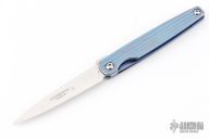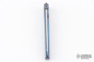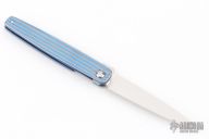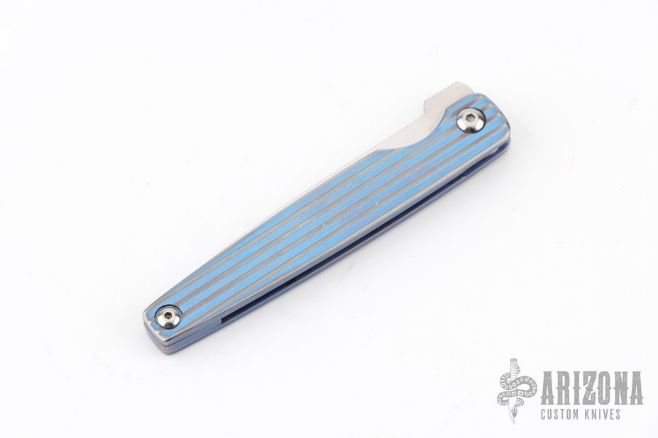 This Mini Spike #2 by Phil Boguszewski features a hand rub satin finished blade with notched thumbrest. The handle has a ribbed and anodized titanium frame with an inlaid titanium liner. Has a couple light scratches, otherwise excellent condition. Nice detent, lockup, action and blade seating. Leather Velcro case.