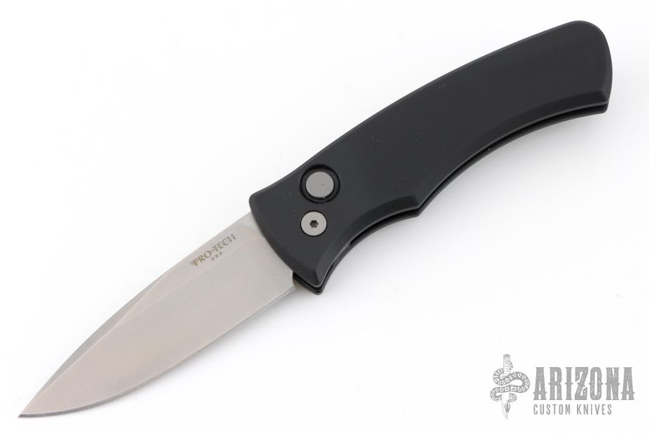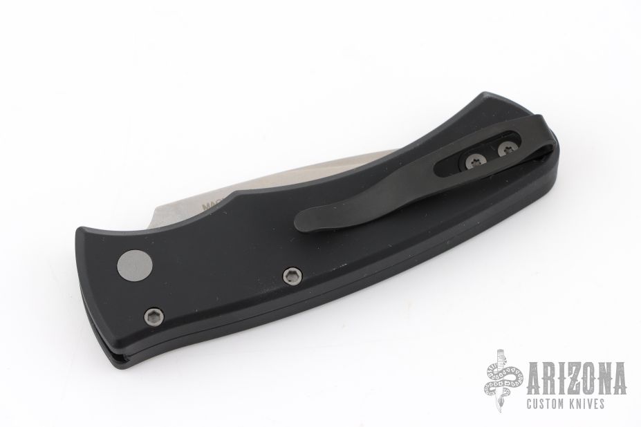 This Duke by Pro-tech features a stonewashed drop point blade. The handle has a black aluminum frame with a matching tip-up steel pocket clip. Includes the original box and papers. New from maker!